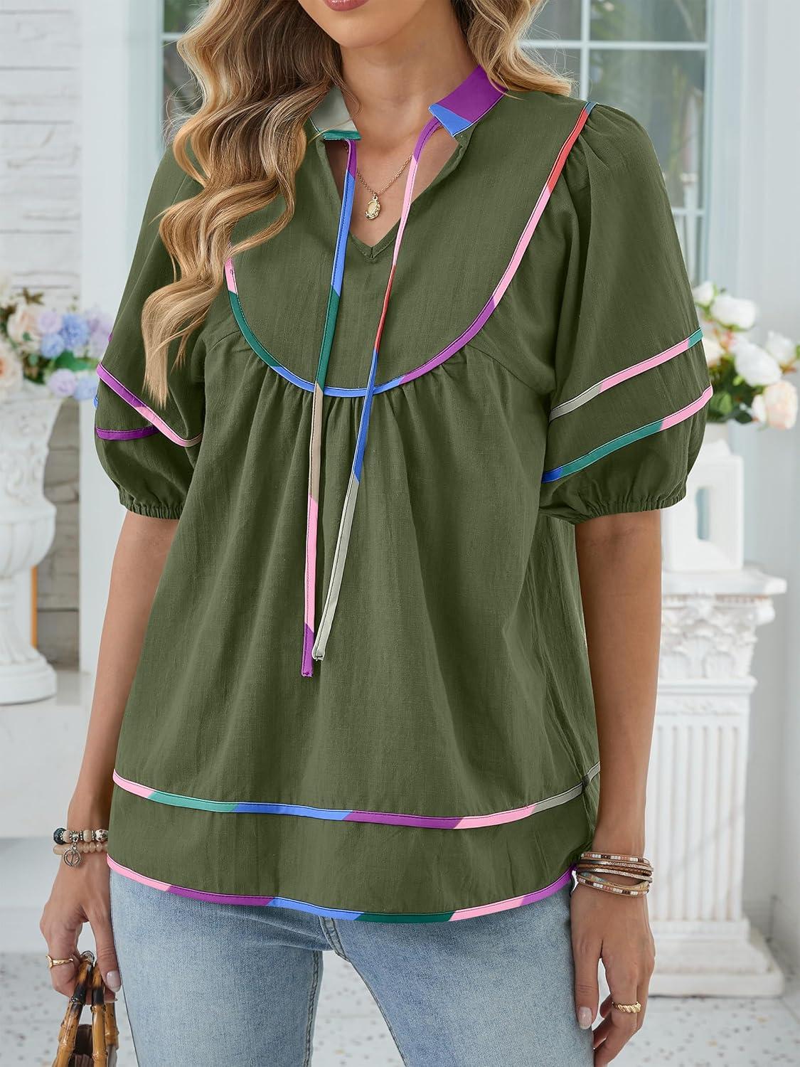 Womens Summer Babydoll Tops V Neck Short Lantern Sleeve Shirts Cute Loose Fit Peplum Flowy Casual Blouses