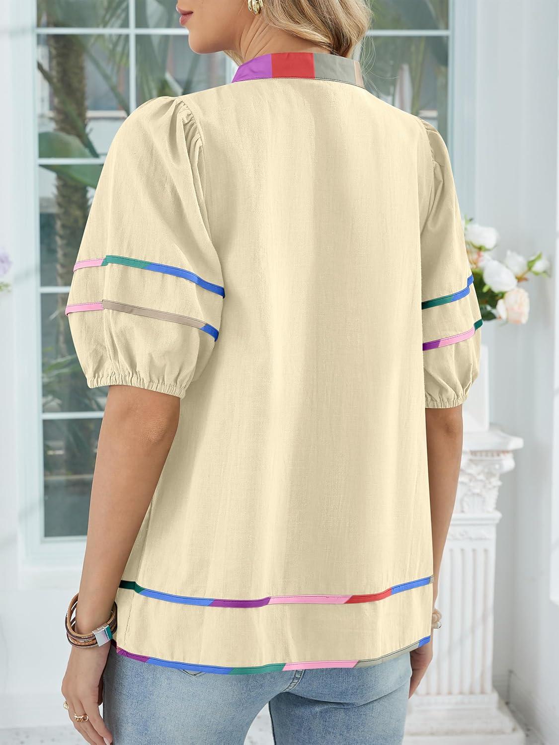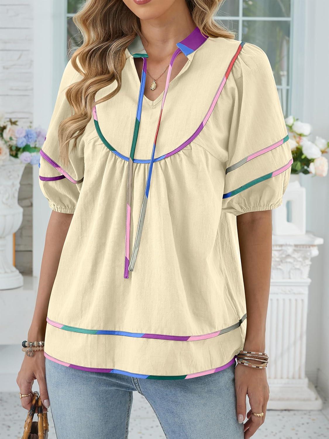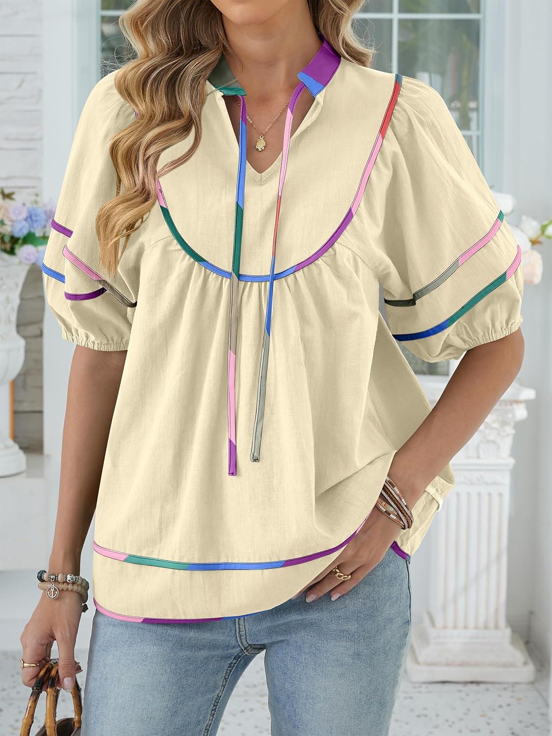 Womens Summer Babydoll Tops V Neck Short Lantern Sleeve Shirts Cute Loose Fit Peplum Flowy Casual Blouses
