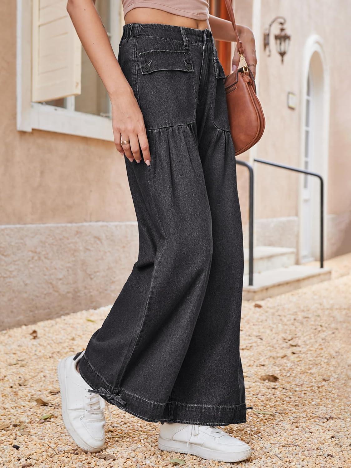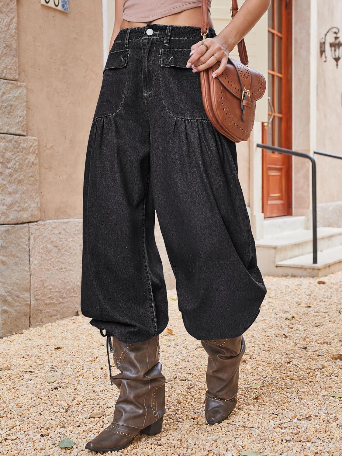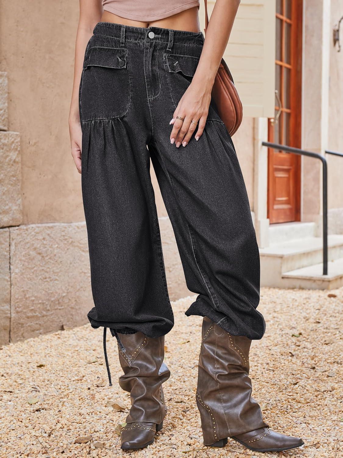ANRABESS Women’s Baggy Jeans 2025 Fashion Mid Rise Tie Ankle Wide Leg Harem Palazzo Denim Pants with Pockets(Black)