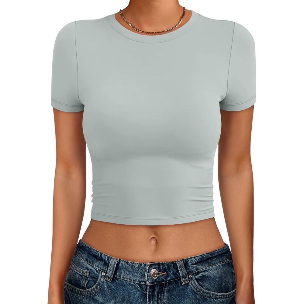 ANRABESS Womens Basic Tee Summer Outfits Crewneck Short Sleeve Crop Tops Slim Fitted T Shirts Y2k 2026 Trendy Clothing(Light Gray)