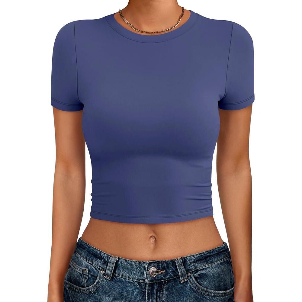 ANRABESS Womens Basic Tee Summer Outfits Crewneck Short Sleeve Crop Tops Slim Fitted T Shirts Y2k 2026 Trendy Clothing(Navy Blue)