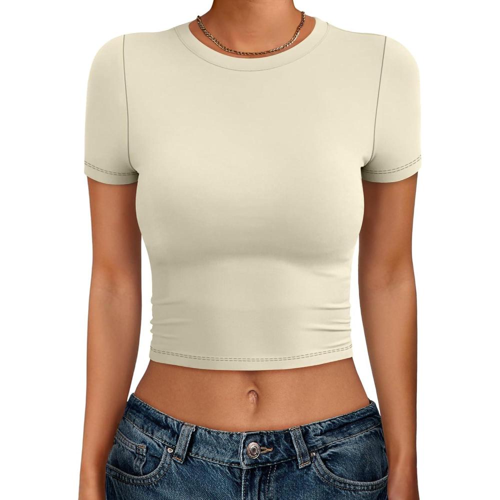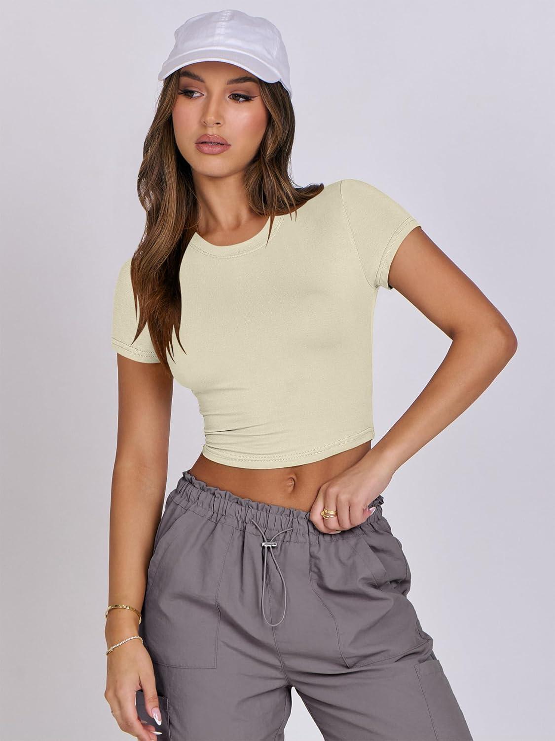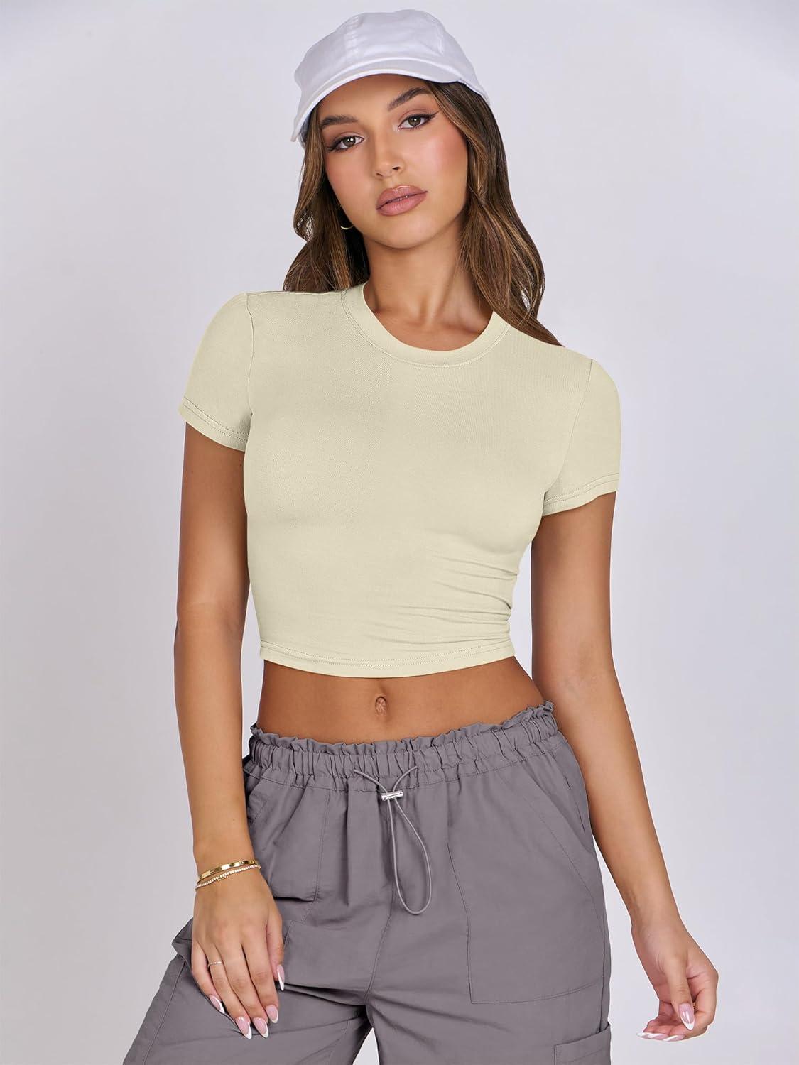 ANRABESS Womens Basic Tee Summer Outfits Crewneck Short Sleeve Crop Tops Slim Fitted T Shirts Y2k 2026 Trendy Clothing(Parchment)