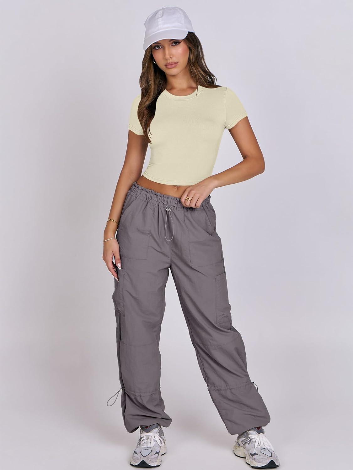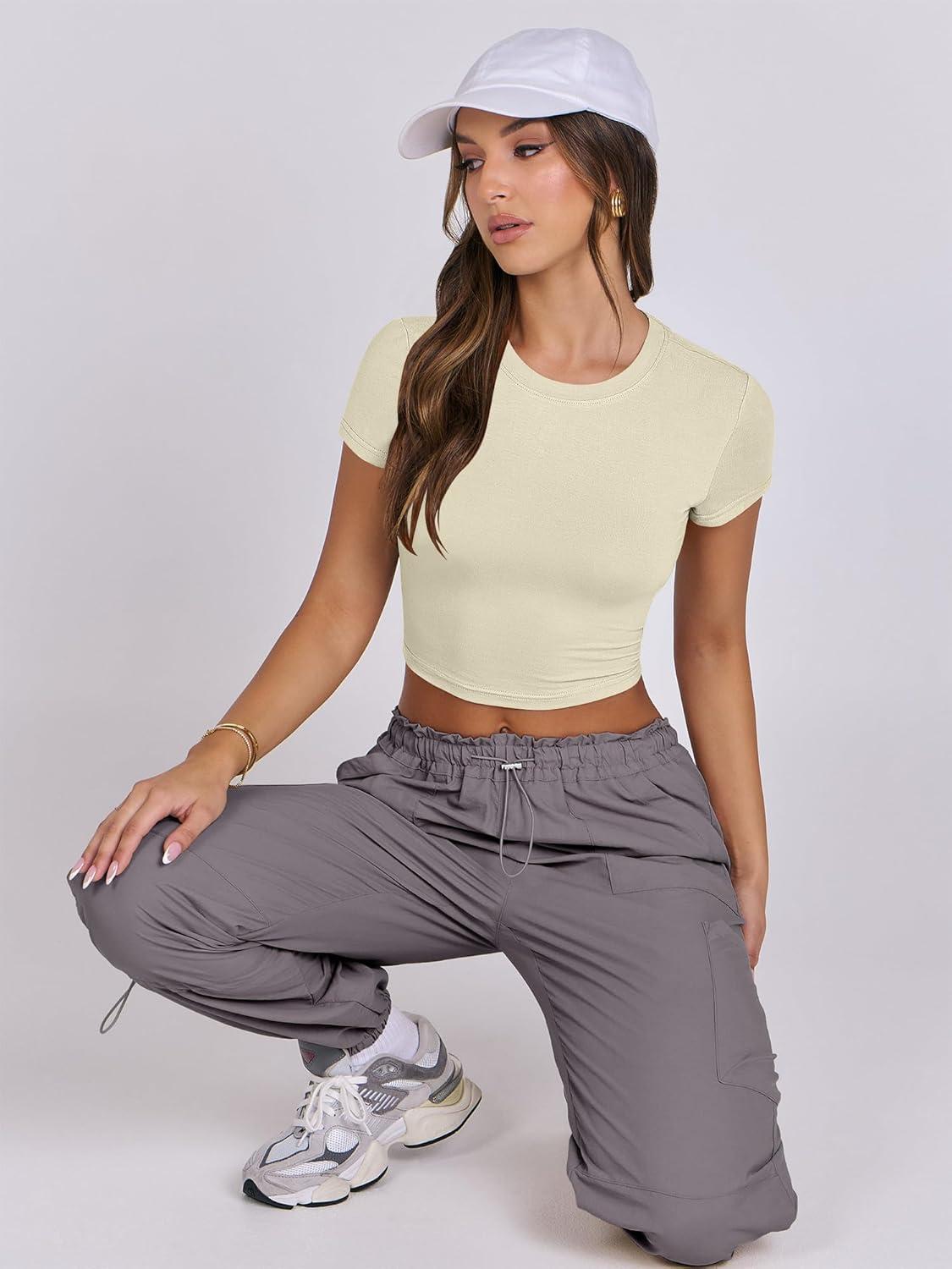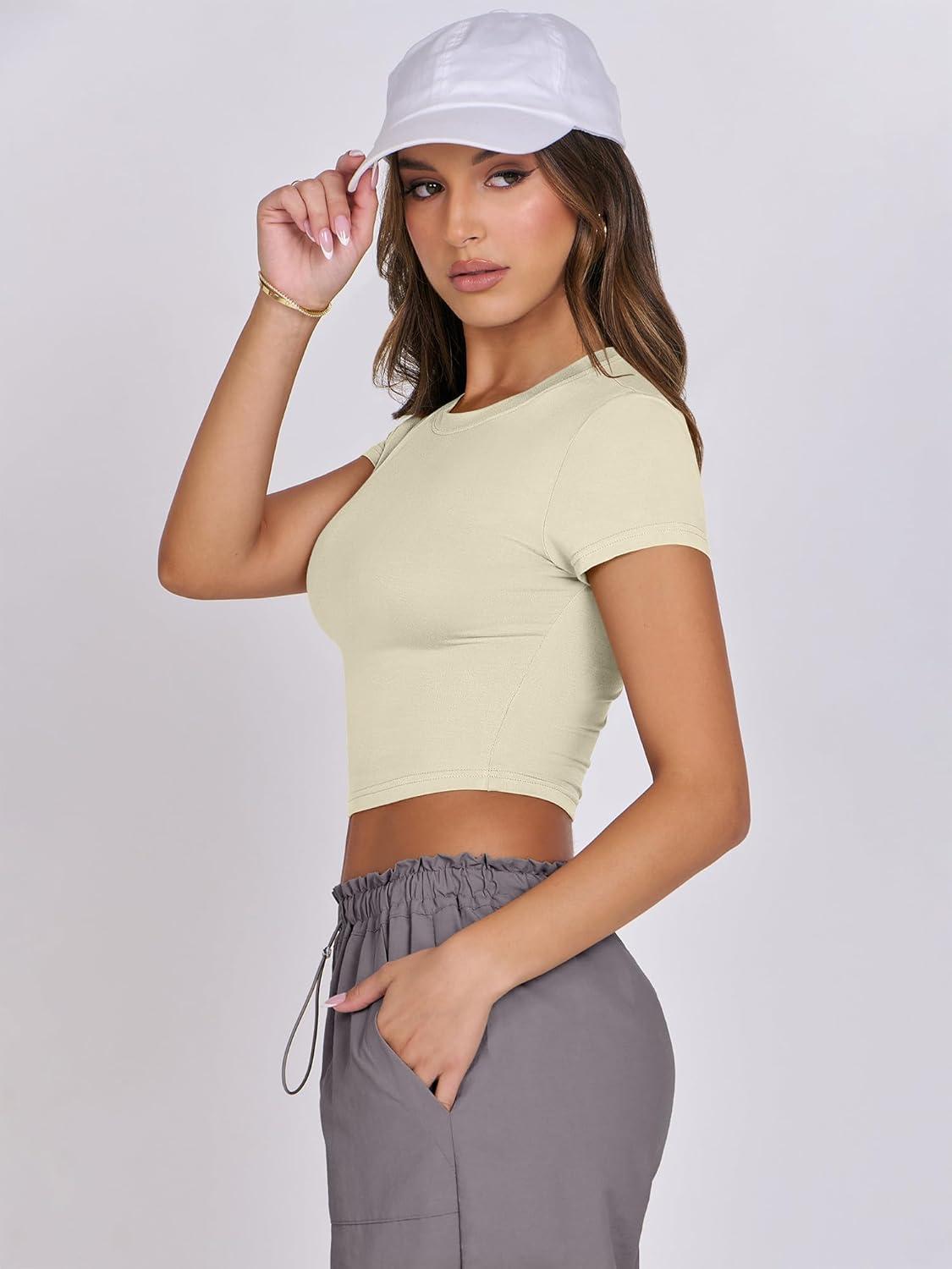 ANRABESS Womens Basic Tee Summer Outfits Crewneck Short Sleeve Crop Tops Slim Fitted T Shirts Y2k 2026 Trendy Clothing(Parchment)