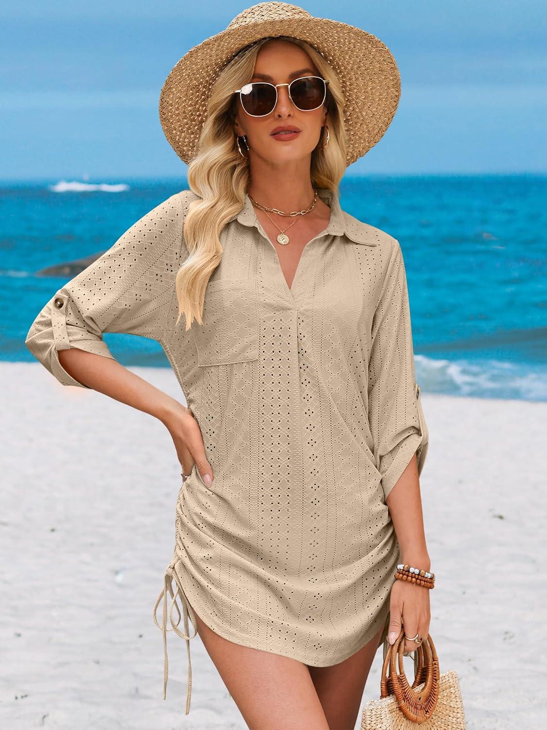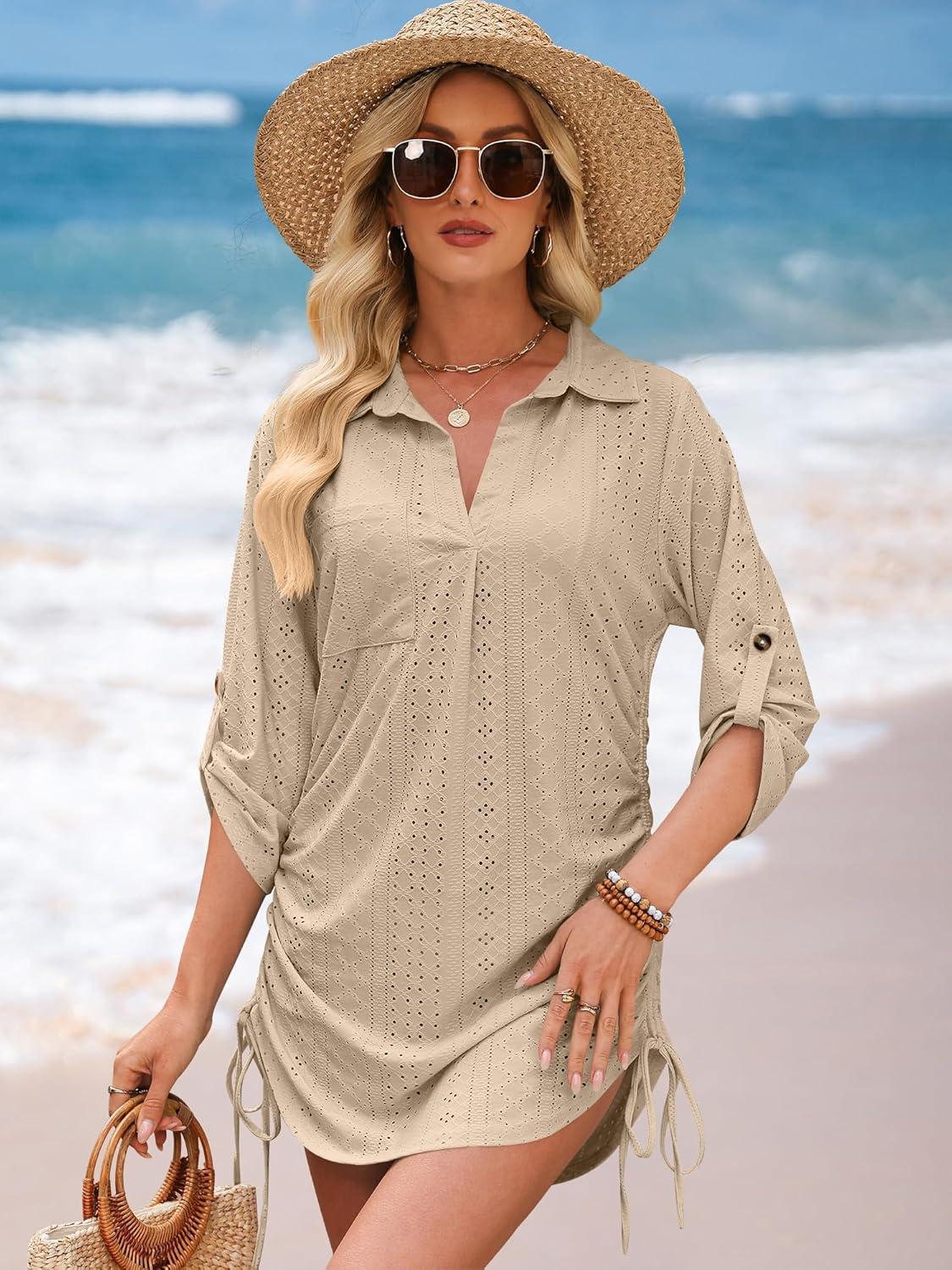 ANRABESS Womens Bathing Suit Cover Ups Swimsuit Beach Coverup Hollow Out Swimwear 2026 Summer Outfits Bikini Dress Shirt(Apricot)