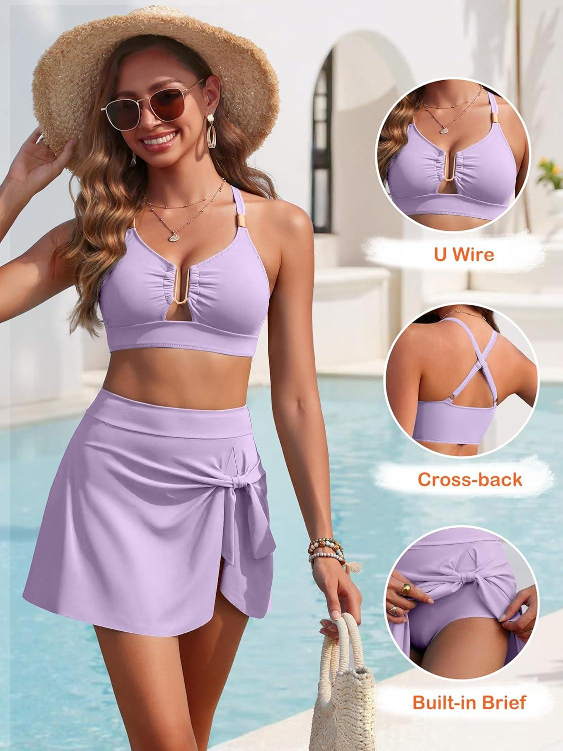 ANRABESS Womens Bikini Sets Two Piece Swim Skirt High Waisted Swimsuits Tummy Control U-Wire Bathing Suit 2026 Beach Swimwear(Light Purple)