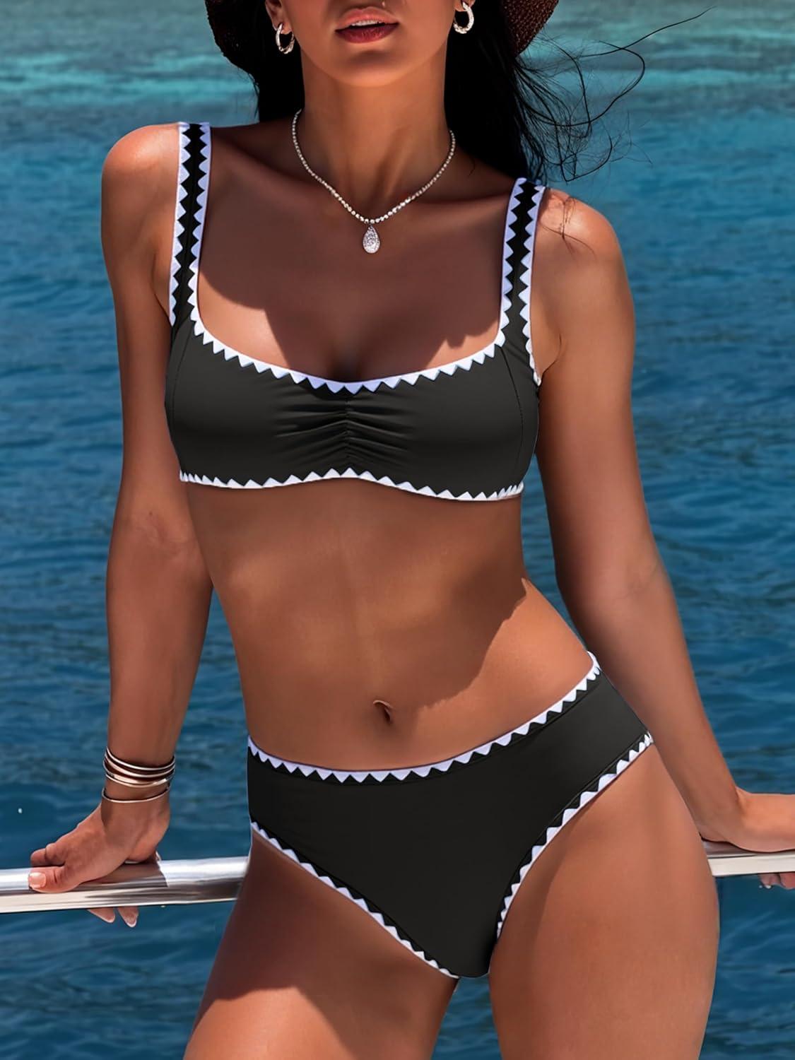 This sexy bikini set with adjustable straps, the wire free bra is removable padding for comfort and adorned with whip stitch detailing, combining fashion style and functionality seamlessly. This mid waisted swimsuit comes in both solid colors and color-block styles, offering moderate coverage while being both fashionable and flattering.