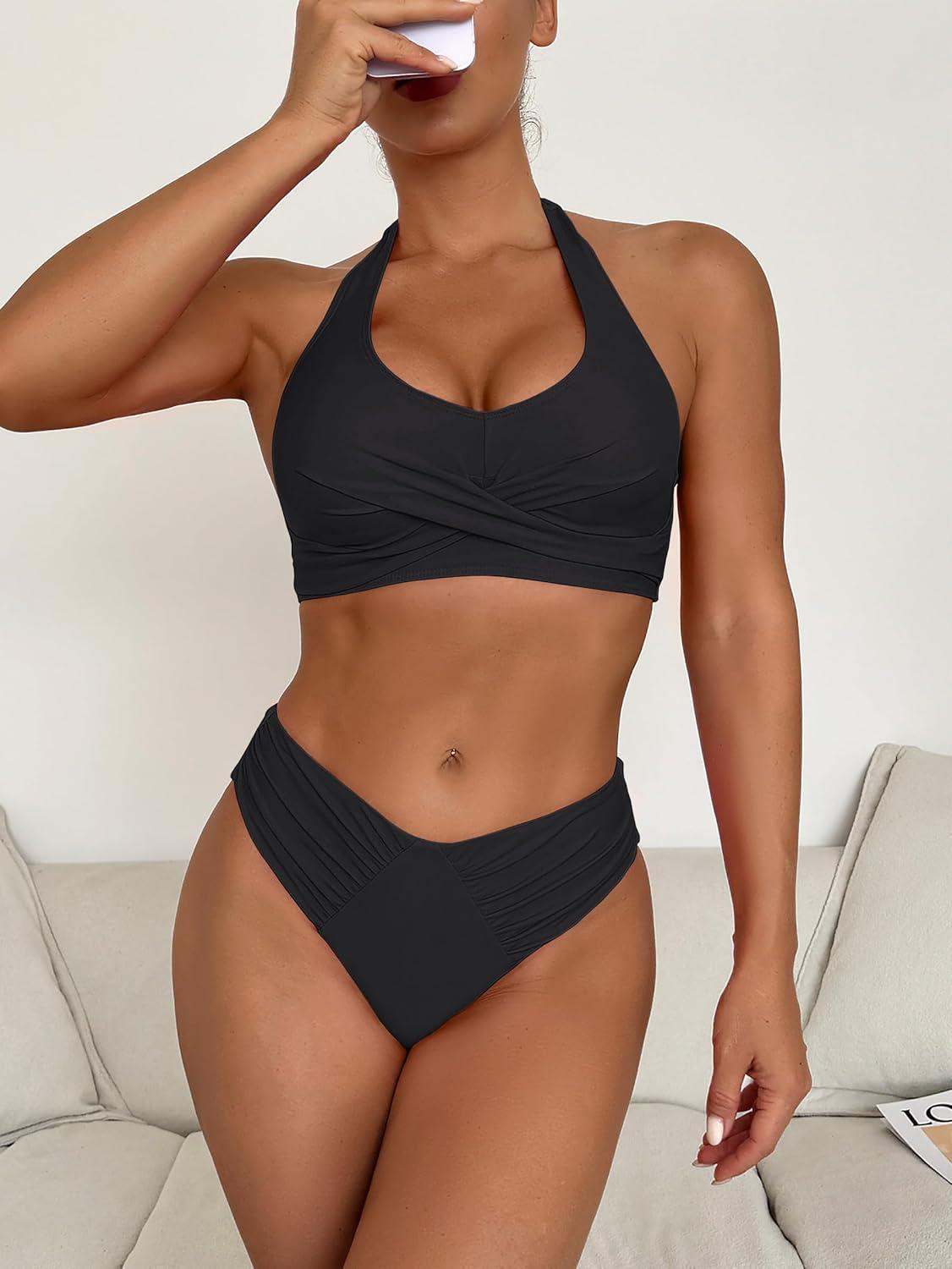 ANRABESS Womens Bikini Sets Two Piece Swimsuits High Waisted Halter Twist Front Bathing Suit 2026 Summer Beach Swimwear(Black)
