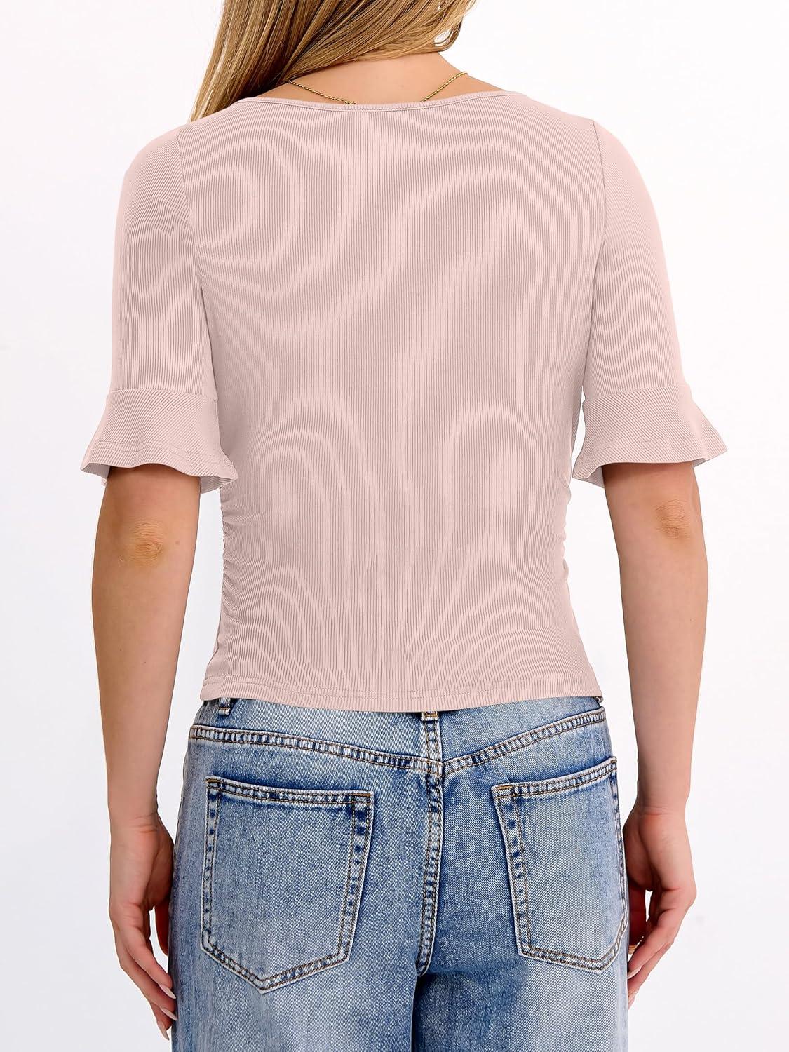 ANRABESS Womens Boat Neck Bell Short Sleeve Shirts Ruched Crop Dressy Work Blouse Business Casual Top 2026 Spring Clothing(Apricot)