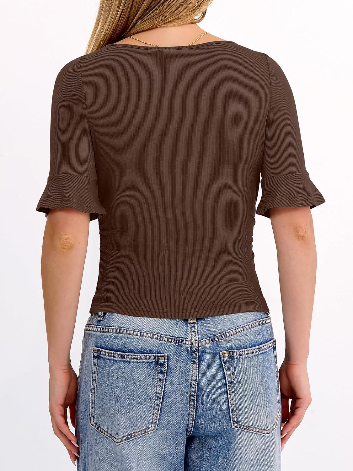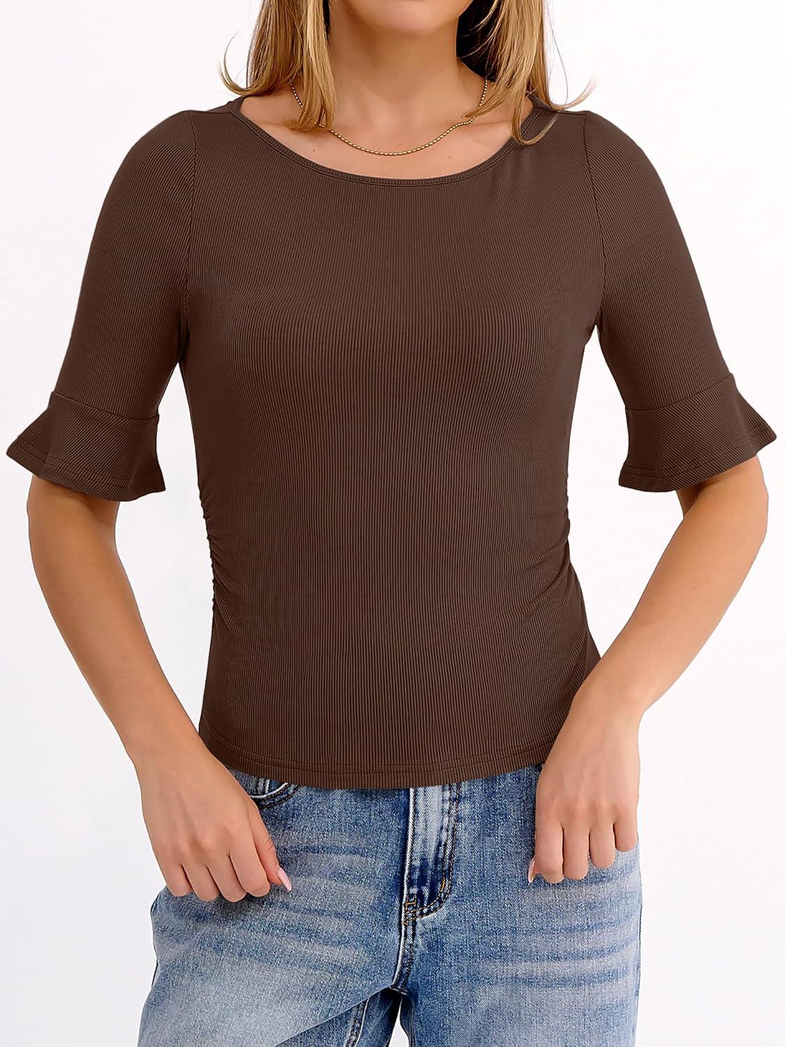 ANRABESS Womens Boat Neck Bell Short Sleeve Shirts Ruched Crop Dressy Work Blouse Business Casual Top 2026 Spring Clothing(Coffee)