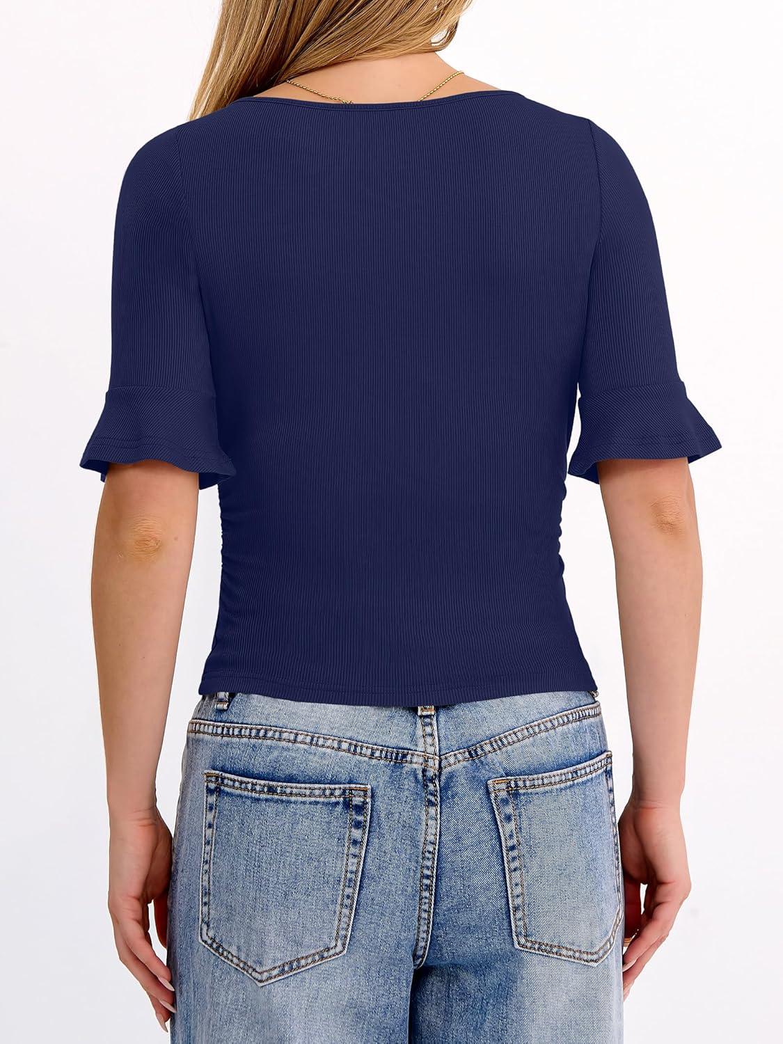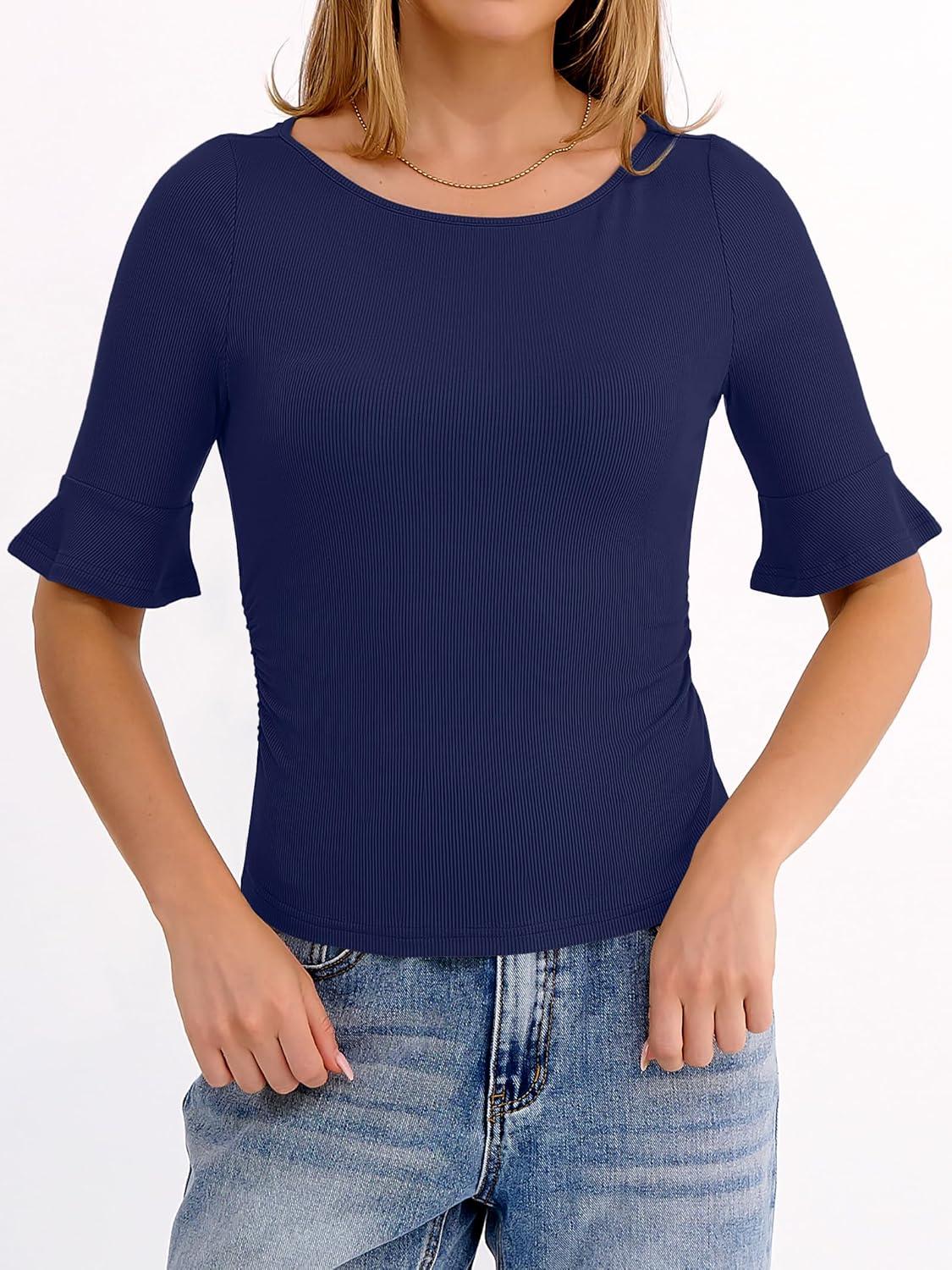 ANRABESS Womens Boat Neck Bell Short Sleeve Shirts Ruched Crop Dressy Work Blouse Business Casual Top 2026 Spring Clothing(Navy Blue)