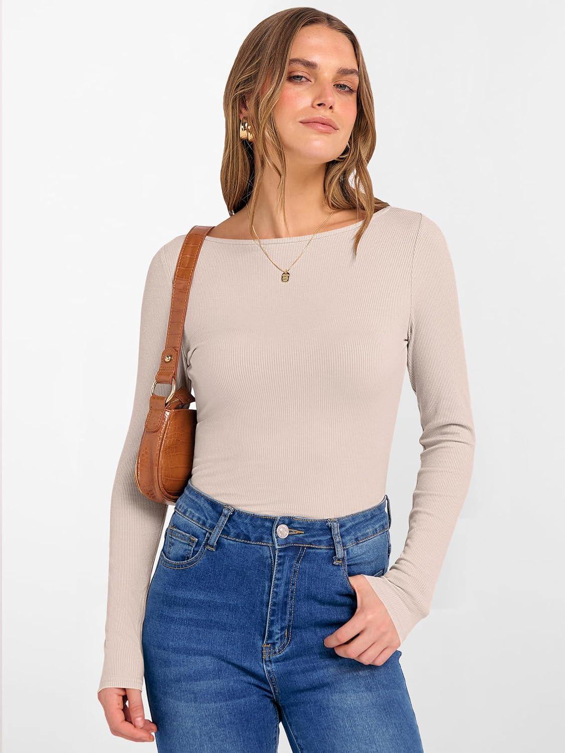 ANRABESS Women’s Boat Neck Long Sleeve Shirts Rib Knit Slim Fitting Tops Basic Tees 2026 Casual Comfy Fall Outfits Clothes(Beige)