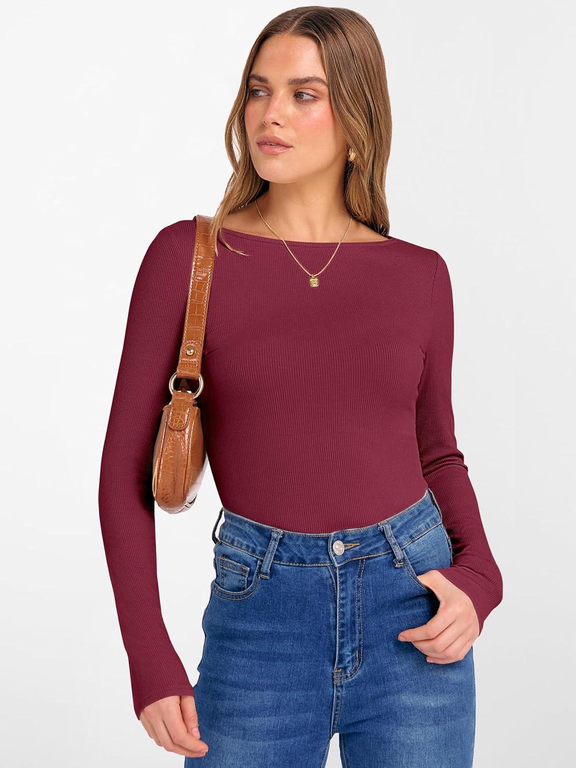 ANRABESS Women's Boat Neck Long Sleeve Shirts Rib Knit Slim Fitting Tops Basic Tees 2026 Casual Comfy Fall Outfits Clothes(Deep Red)