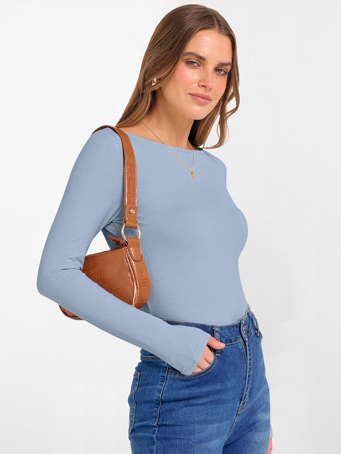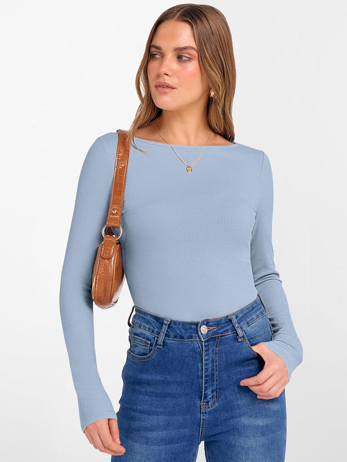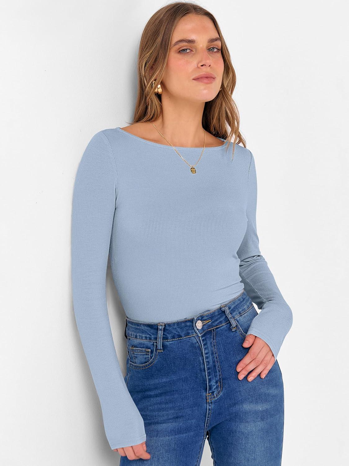 ANRABESS Women’s Boat Neck Long Sleeve Shirts Rib Knit Slim Fitting Tops Basic Tees 2026 Casual Comfy Fall Outfits Clothes(Grey Blue)