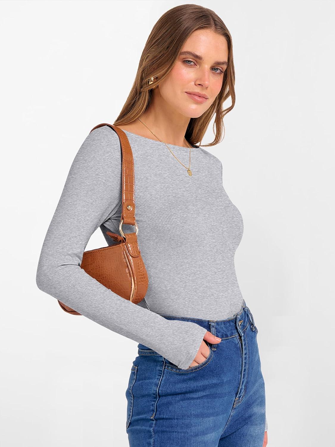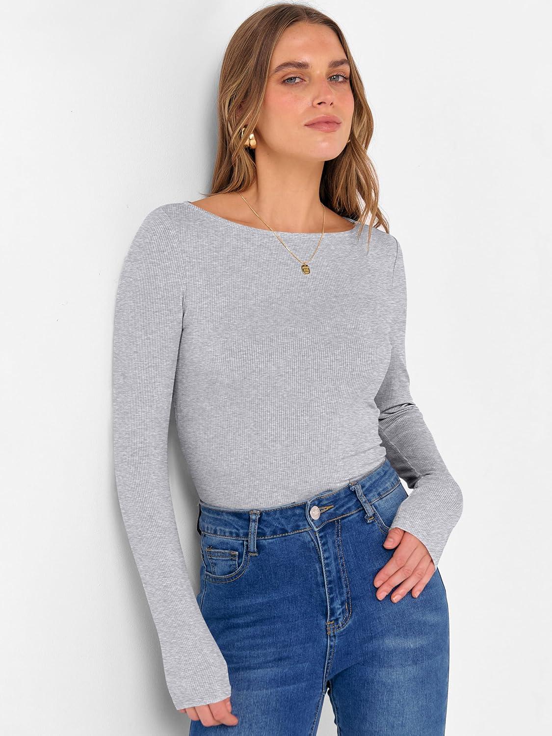 ANRABESS Women's Boat Neck Long Sleeve Shirts Rib Knit Slim Fitting Tops Basic Tees 2026 Casual Comfy Fall Outfits Clothes(Grey)