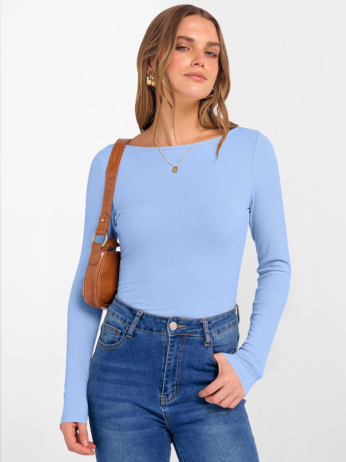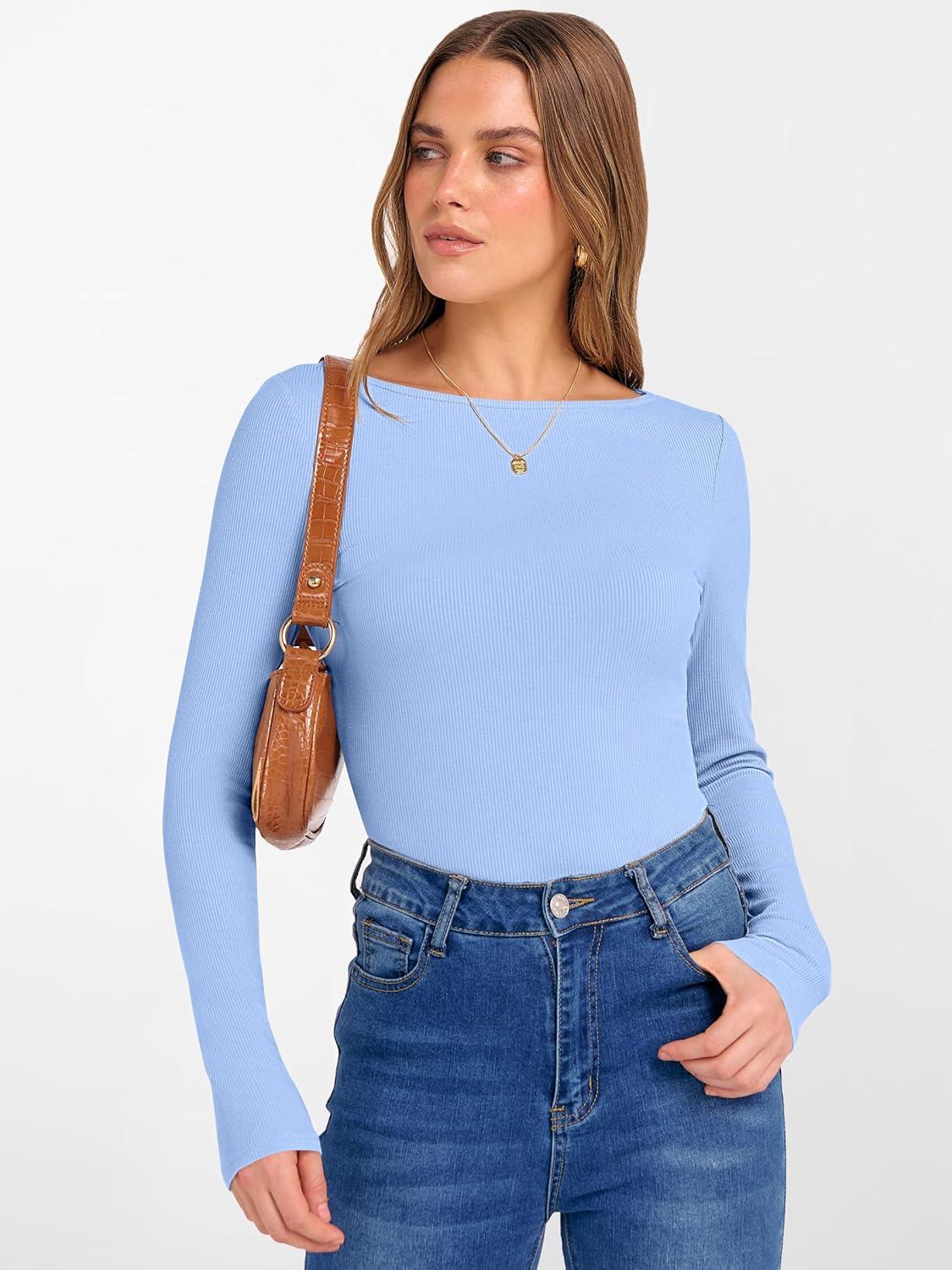 ANRABESS Women’s Boat Neck Long Sleeve Shirts Rib Knit Slim Fitting Tops Basic Tees 2026 Casual Comfy Fall Outfits Clothes(Sky Blue)
