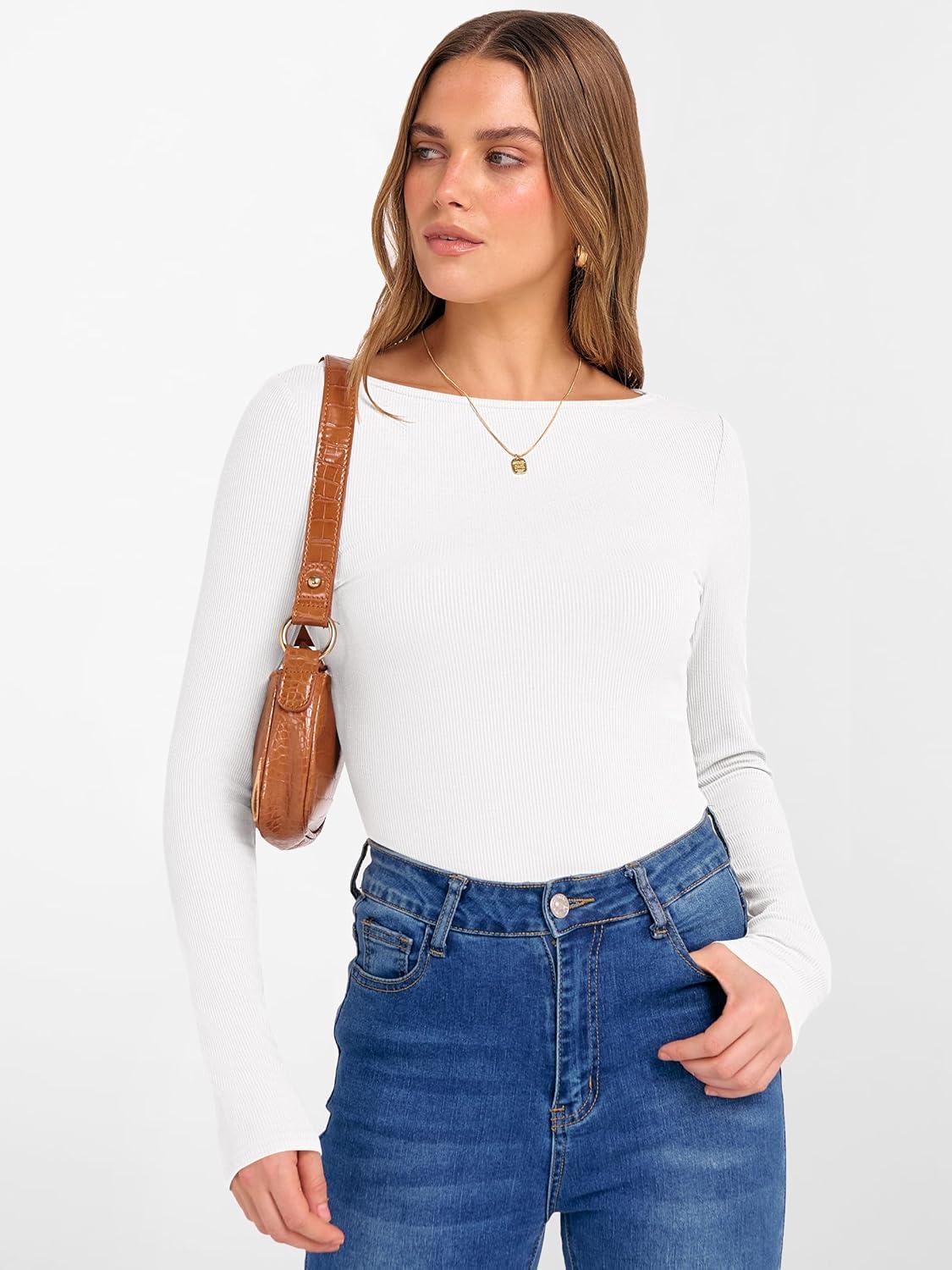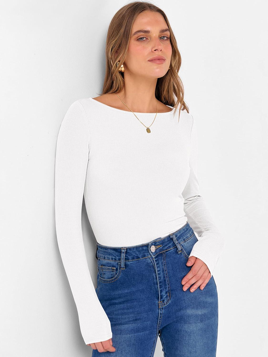 ANRABESS Women’s Boat Neck Long Sleeve Shirts Rib Knit Slim Fitting Tops Basic Tees 2026 Casual Comfy Fall Outfits Clothes(White)