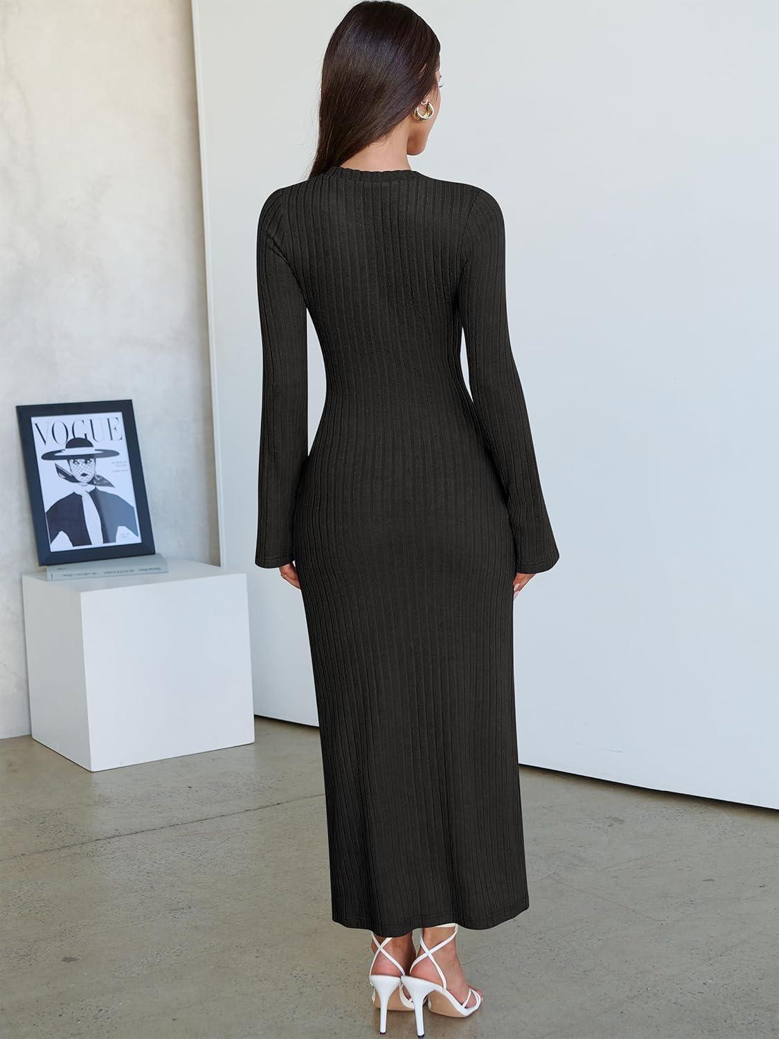 ANRABESS Womens Bodycon Maxi Dresses 2025 Fall Casual Flare Sleeve Crewneck Lounge Comfy Sexy Ribbed Knit Long Sweater Dress