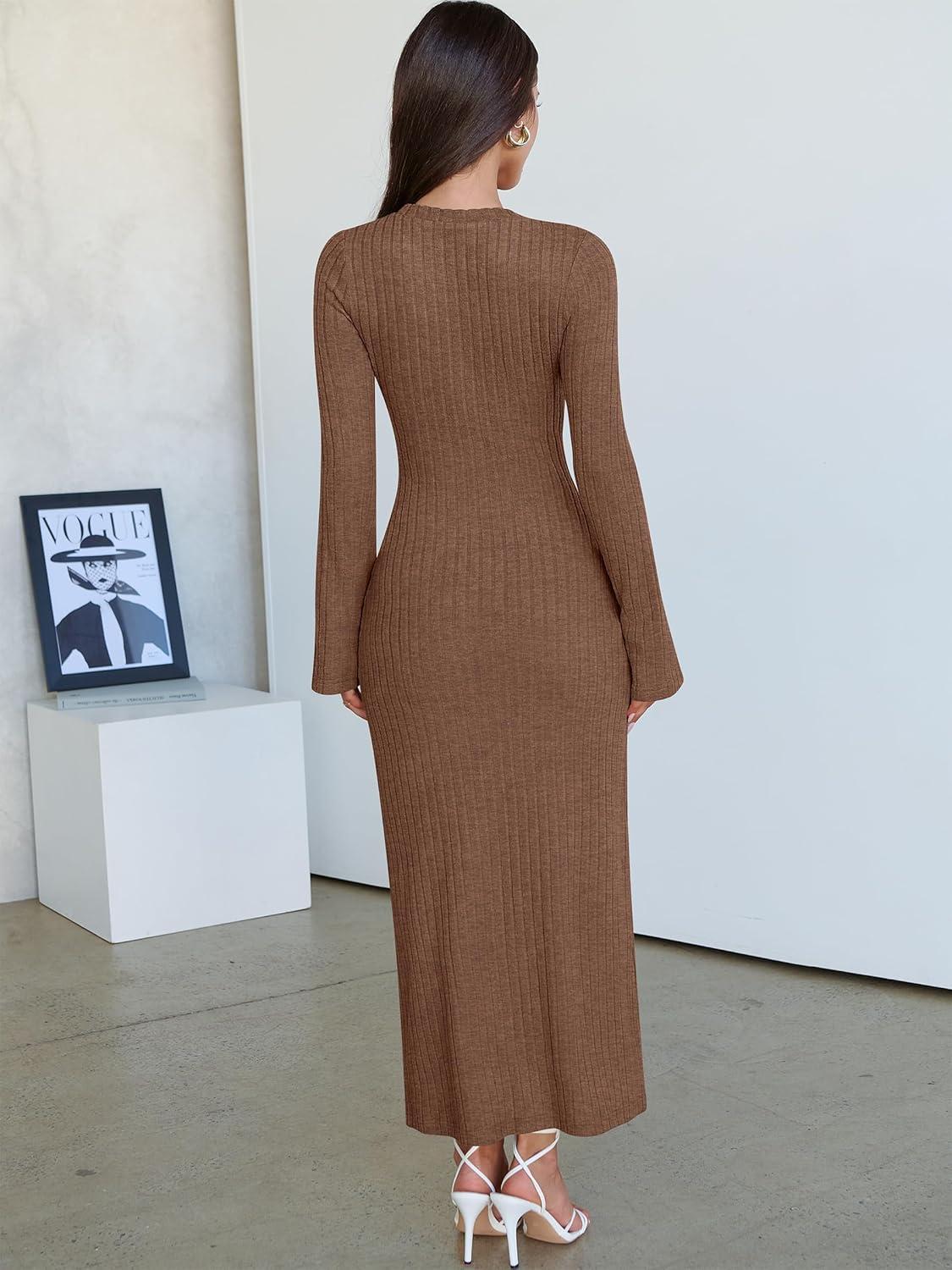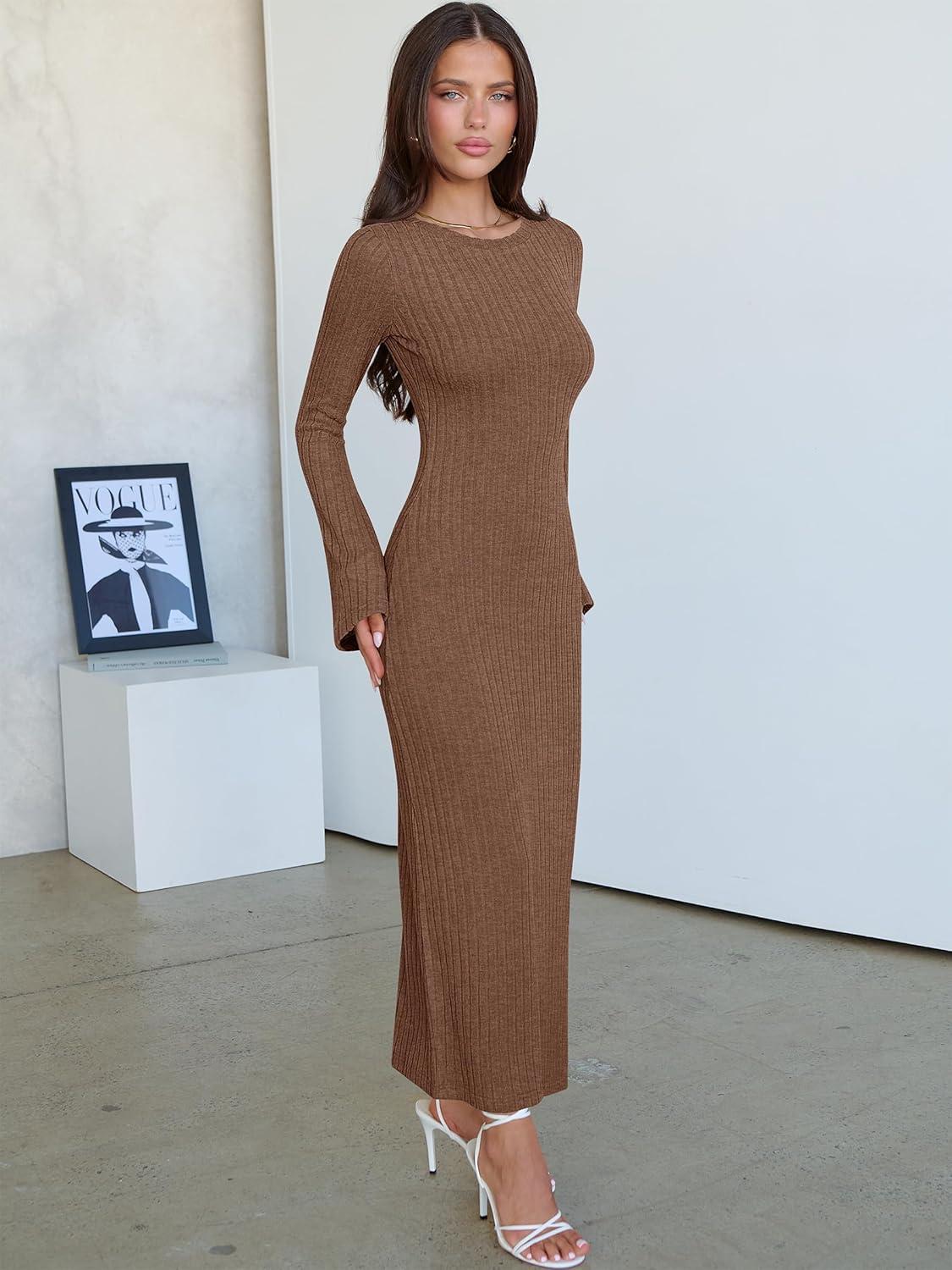imageANRABESS Womens Bodycon Maxi Dresses 2025 Fall Casual Flare Sleeve Crewneck Lounge Comfy Sexy Ribbed Knit Long Sweater DressBrown