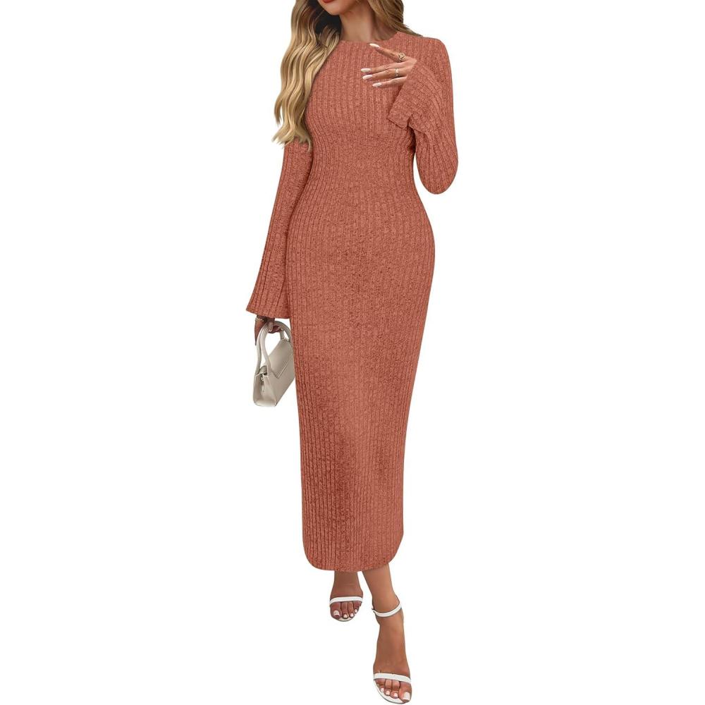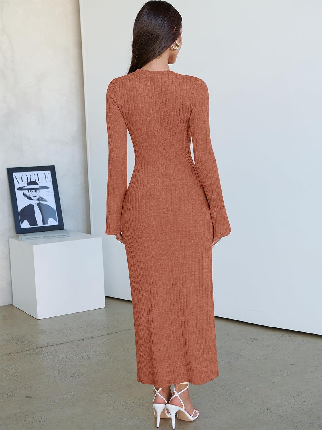 ANRABESS Womens Bodycon Maxi Dresses 2025 Fall Casual Flare Sleeve Crewneck Lounge Comfy Sexy Ribbed Knit Long Sweater Dress(Burnt Orange)