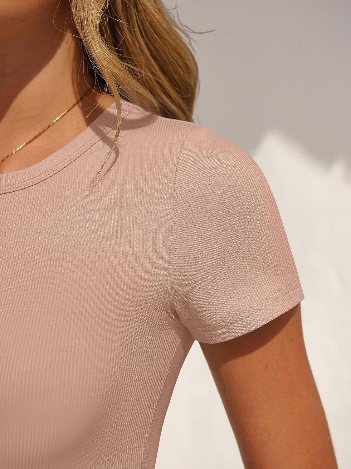 ANRABESS Women’s Bodysuits Short Sleeve Crew Neck Slim Fit Casual Tops Ribbed Knit Soft Basic Tee Shirts Trendy Outfits 2026(Light Apricot)