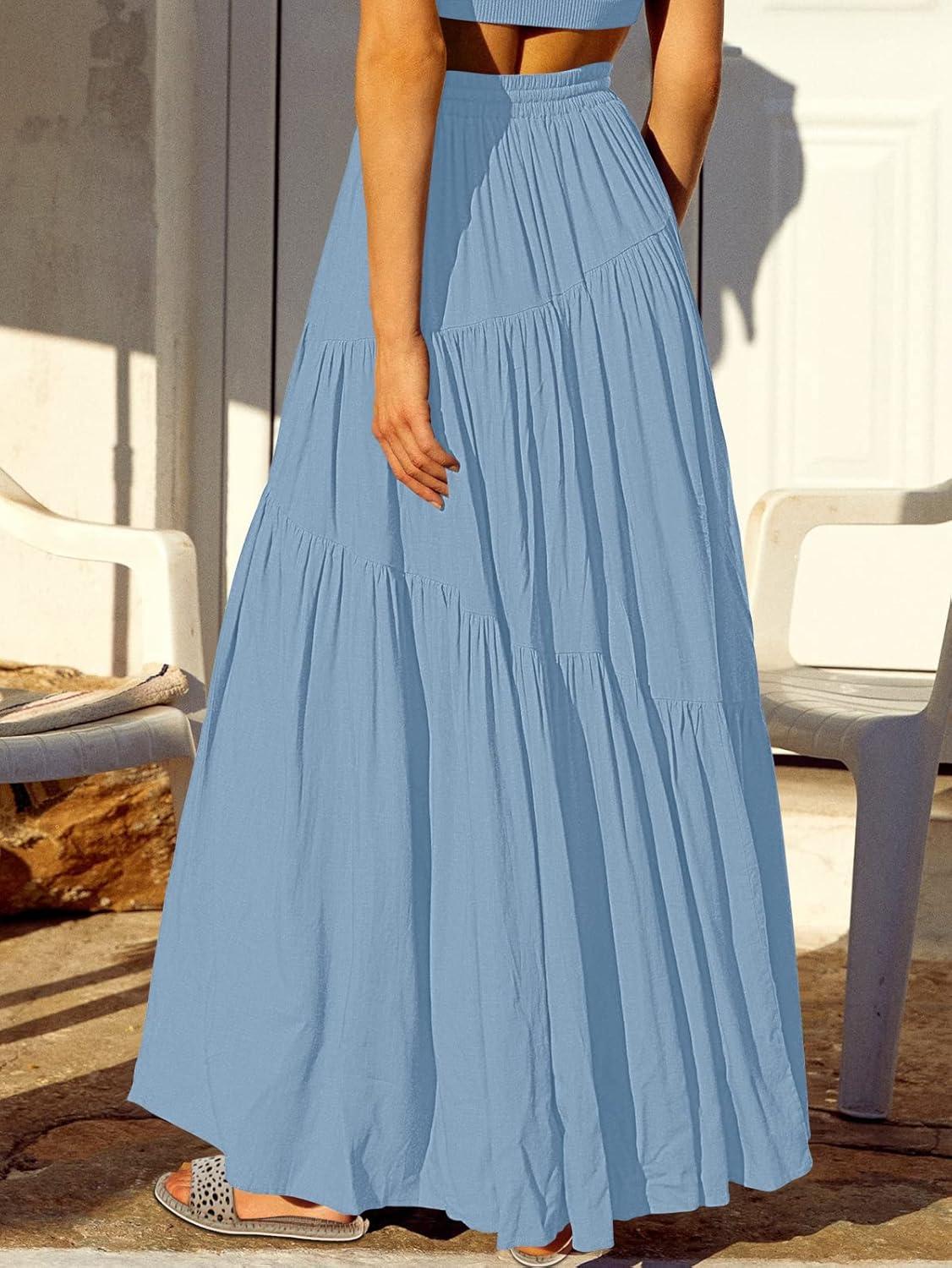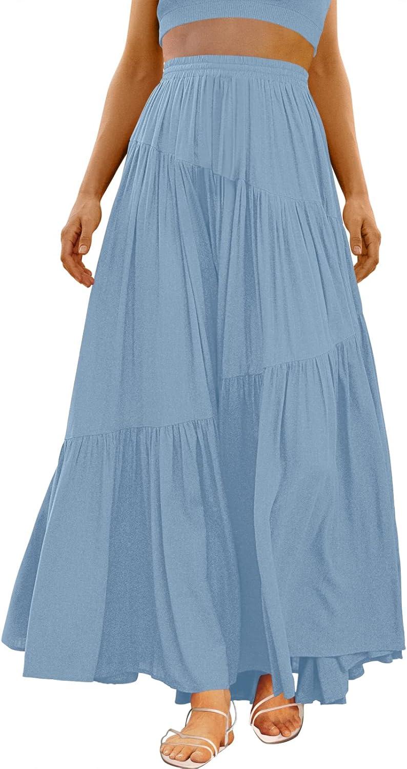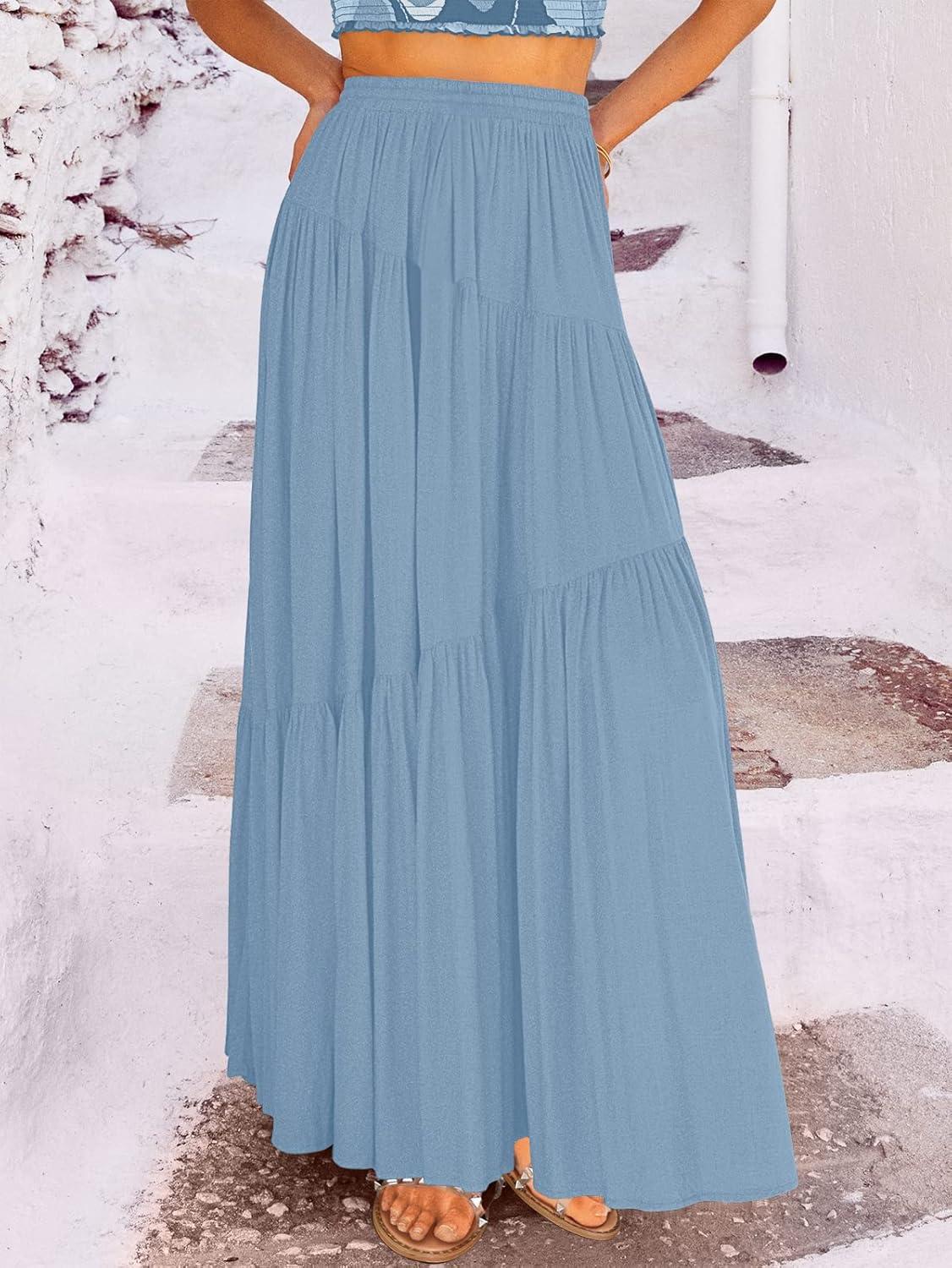 ANRABESS Women’s Boho Elastic High Waist Pleated A-Line Flowy Swing Asymmetric Tiered Maxi Long Skirt Dress with Pockets(Blue)