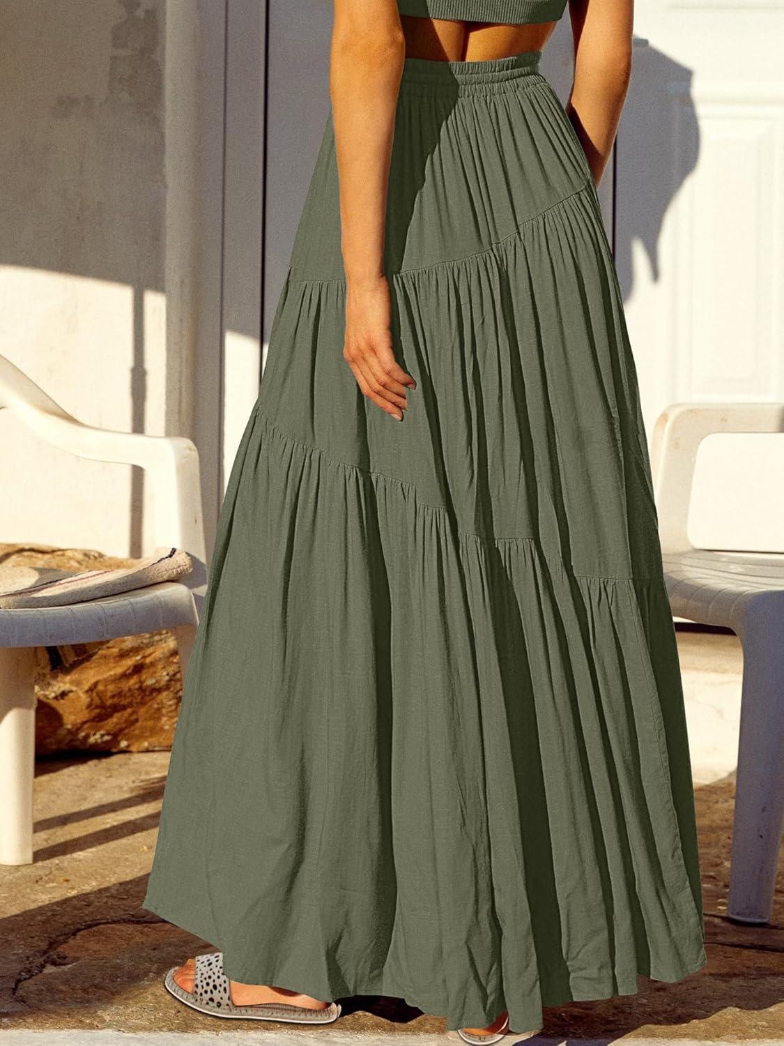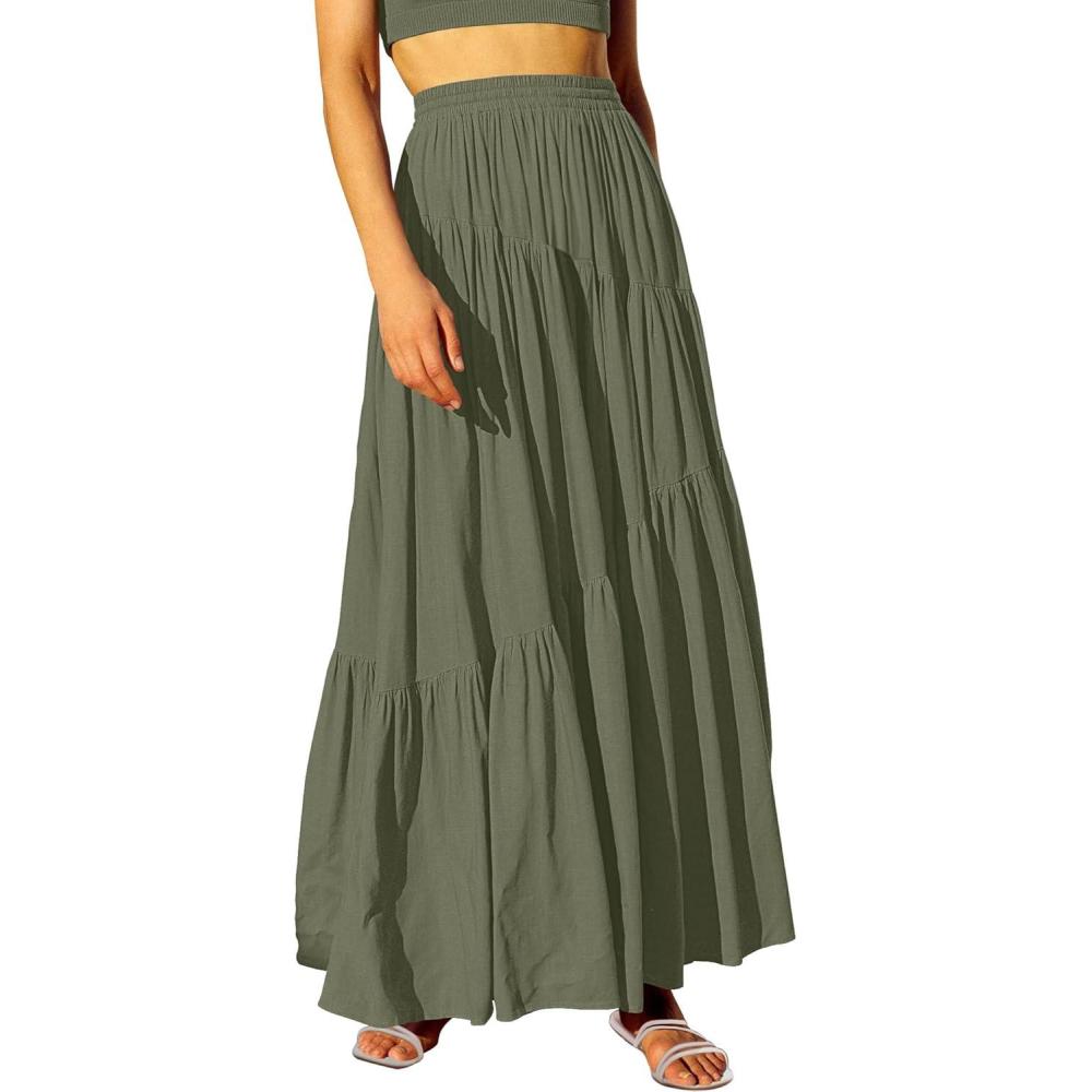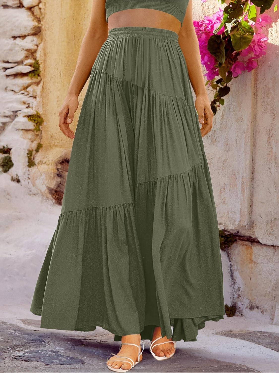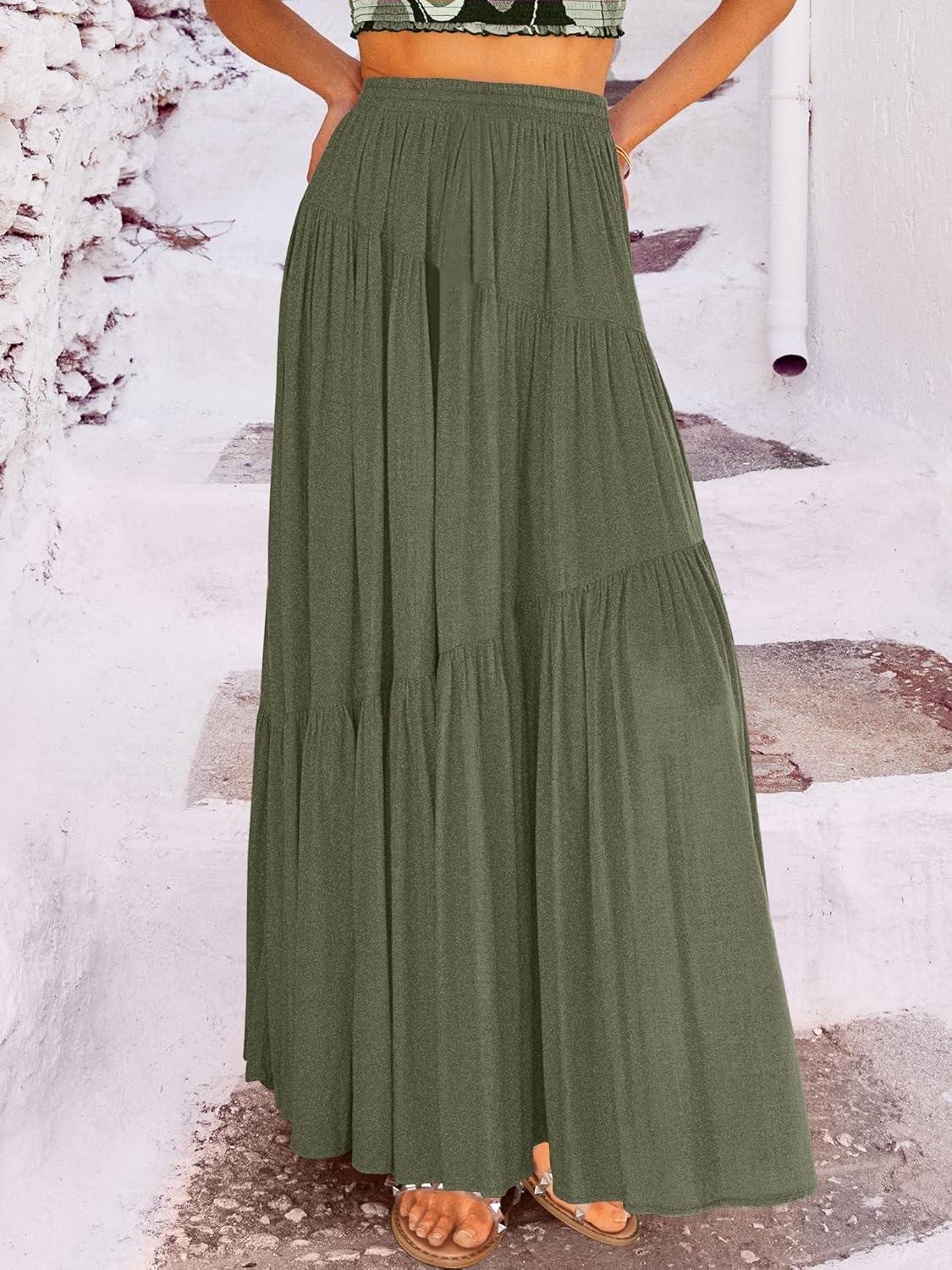 ANRABESS Women’s Boho Elastic High Waist Pleated A-Line Flowy Swing Asymmetric Tiered Maxi Long Skirt Dress with Pockets(Green)