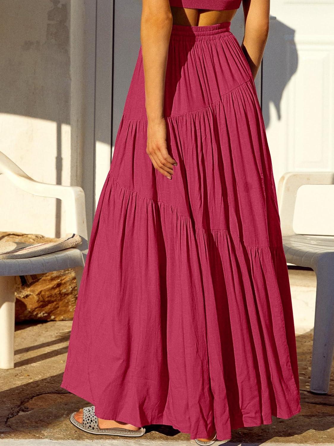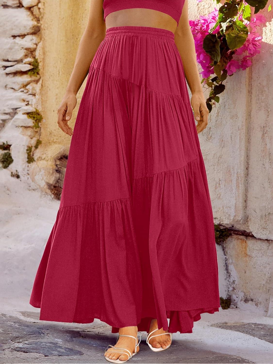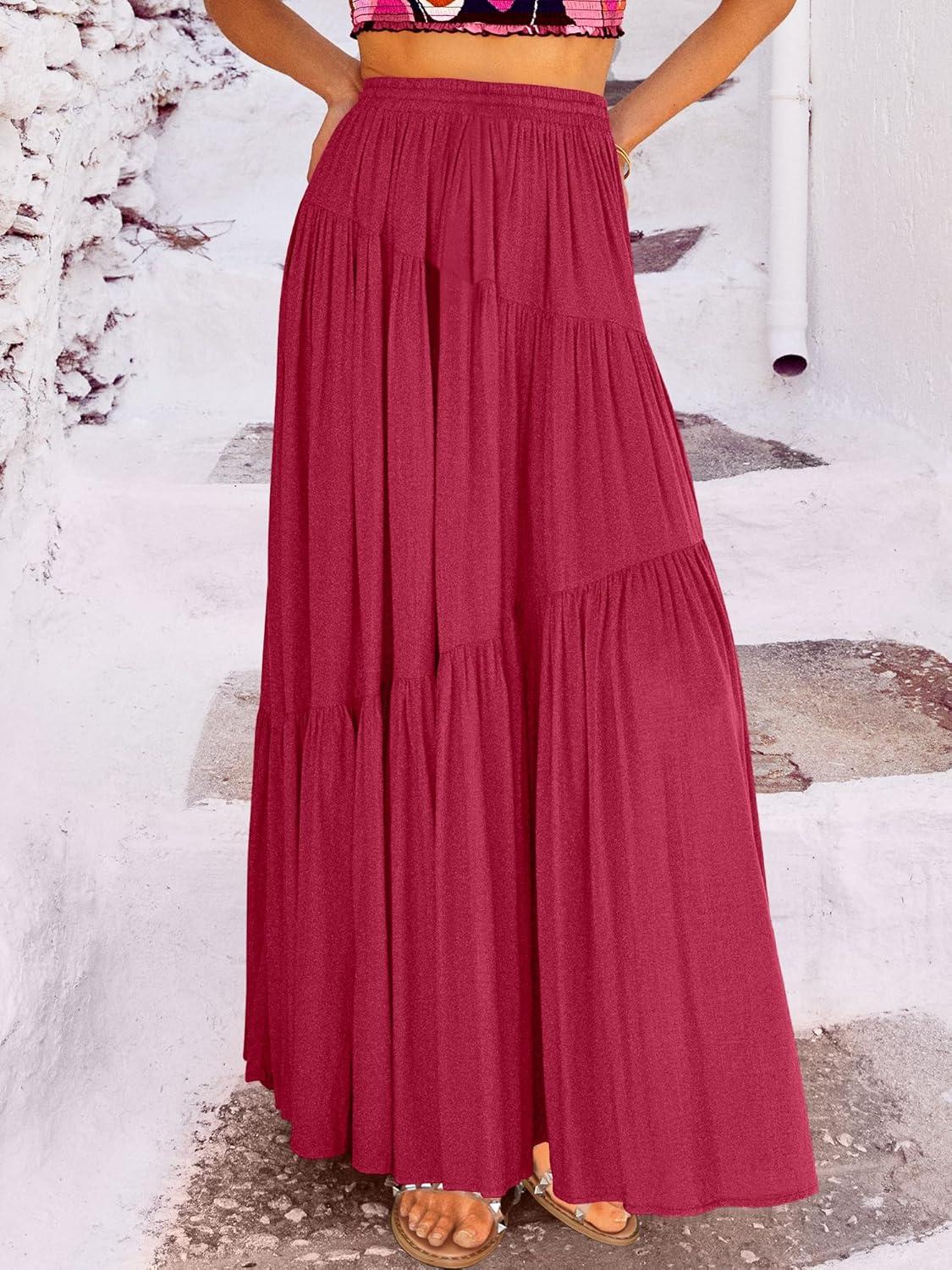 ANRABESS Women’s Boho Elastic High Waist Pleated A-Line Flowy Swing Asymmetric Tiered Maxi Long Skirt Dress with Pockets(Wine Red)