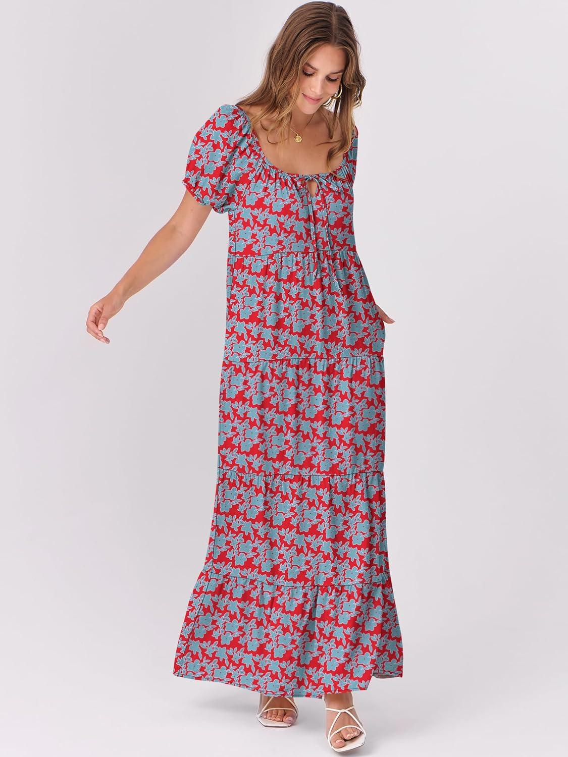 ANRABESS Women's Boho Maxi Dresses 2025 Summer Casual Floral Puff Short Sleeve Tie Front Flowy Swing Tiered Long Beach Dress(Red Blue)