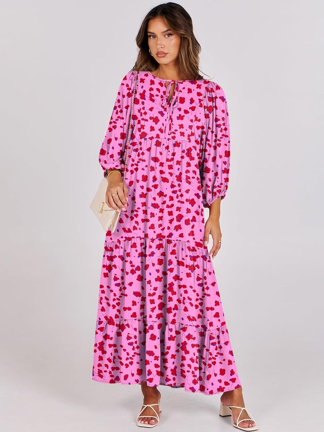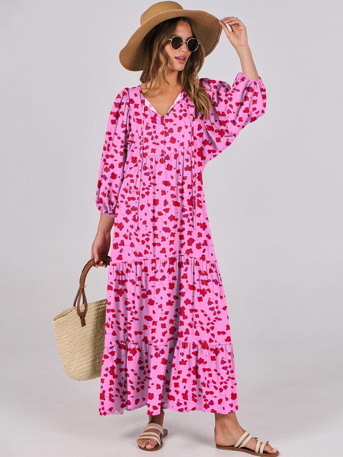 ANRABESS Womens Boho Maxi Dresses 2025 Summer V Neck Puff Sleeve Floral Flowy Swing Fall Casual Long Dress(Rose Red Floral)