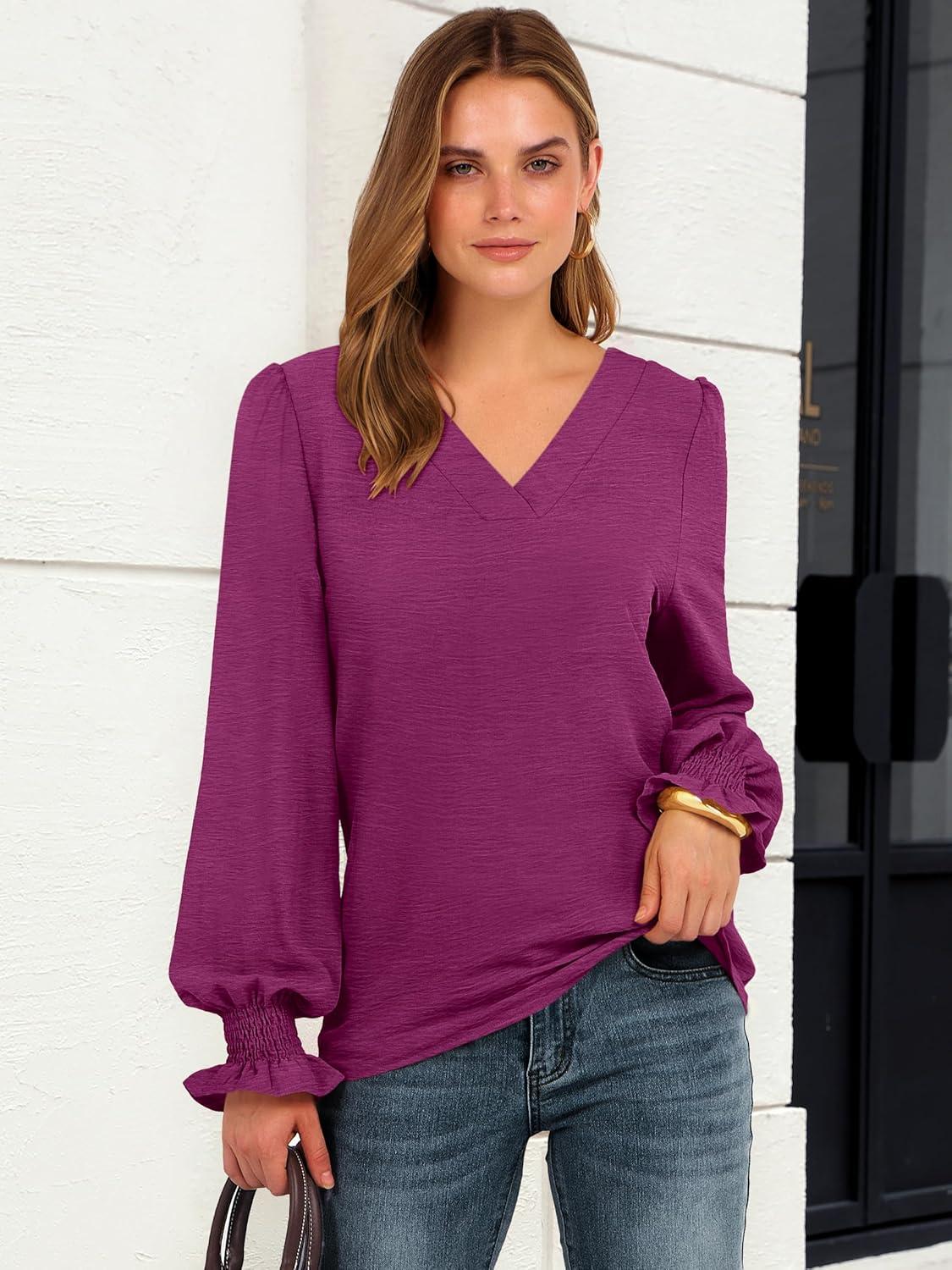 ANRABESS Women’s Business Casual Tops V Neck Puff Long Sleeve Shirts Dressy Office Work Blouse 2025 Fall Outfits Clothes(Purple Red)
