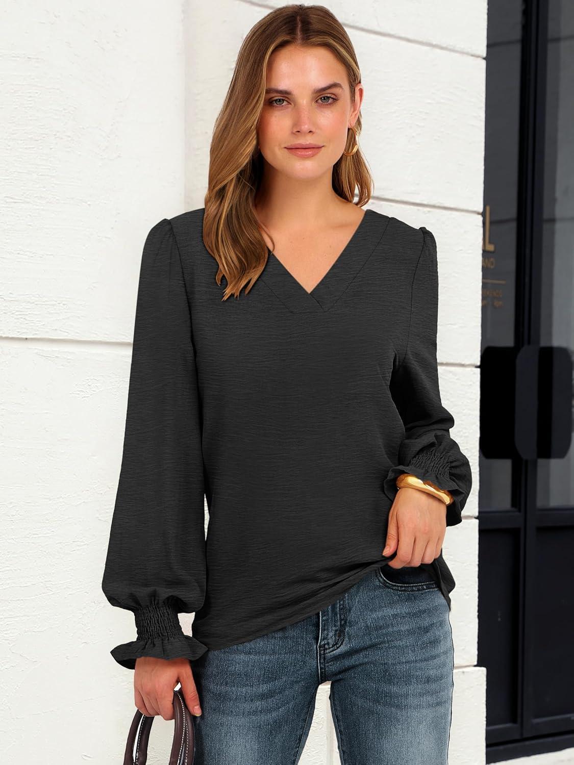 ANRABESS Women’s Business Casual Tops V Neck Puff Long Sleeve Shirts Dressy Office Work Blouse 2026 Fall Outfits Clothes(Black)