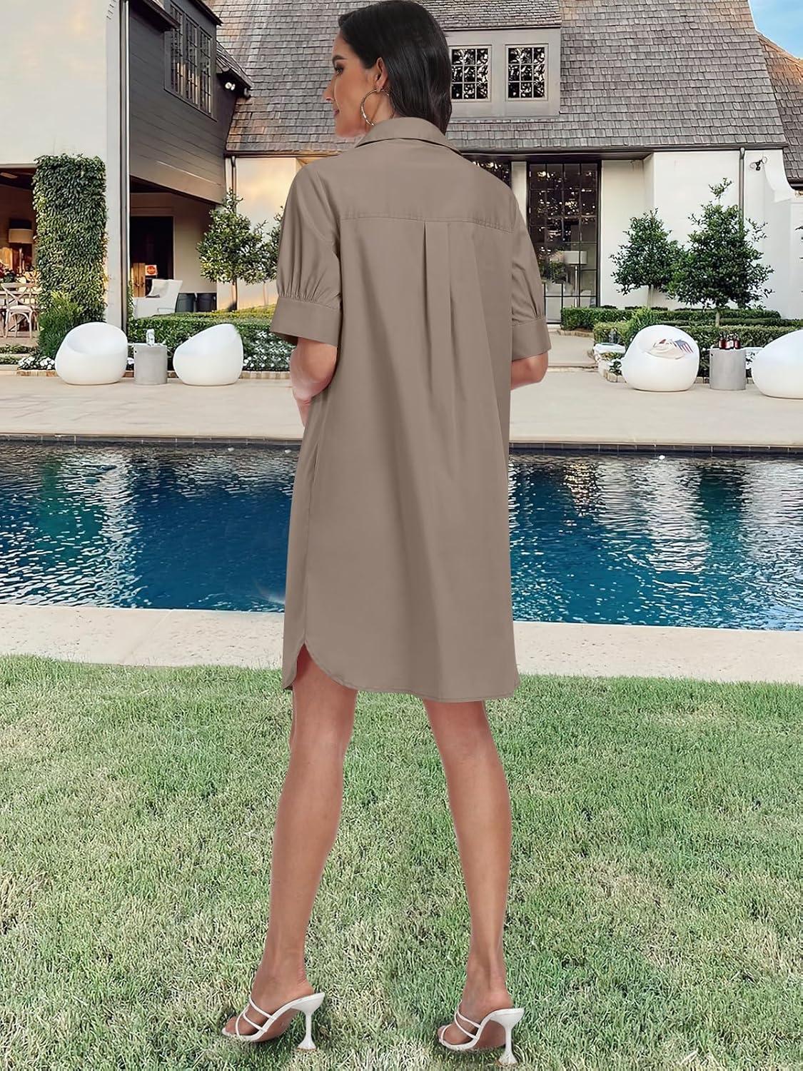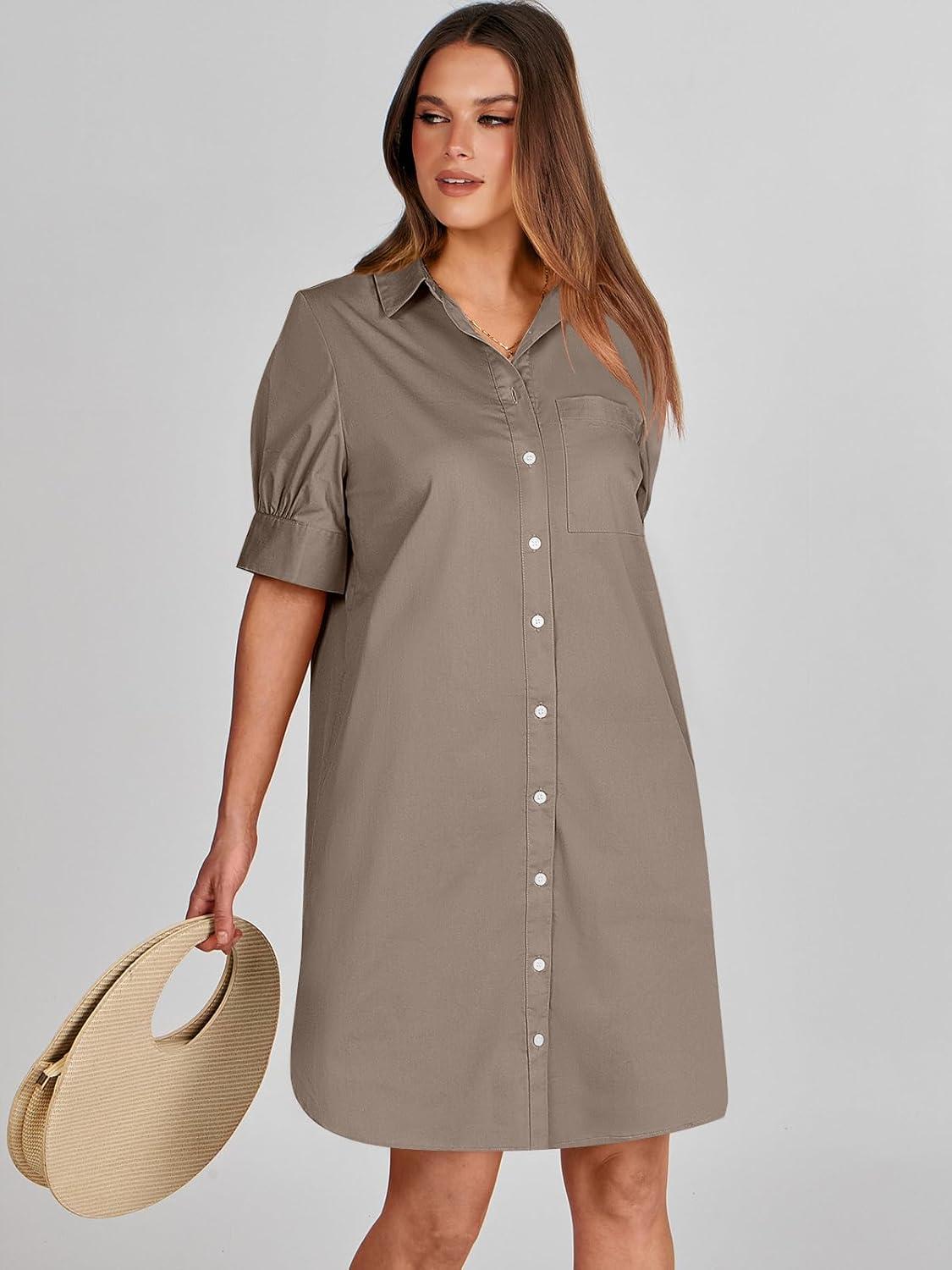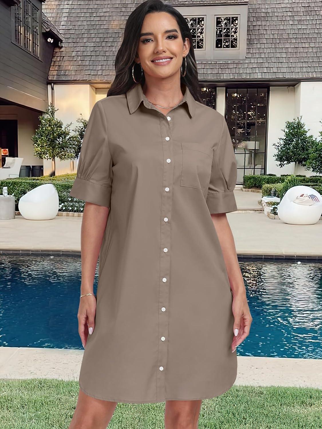 ANRABESS Womens Button Down Shirt Dress Summer Short Sleeve Business Casual Shift Dresses with Pockets 2026 Trendy(Deep Khaki)