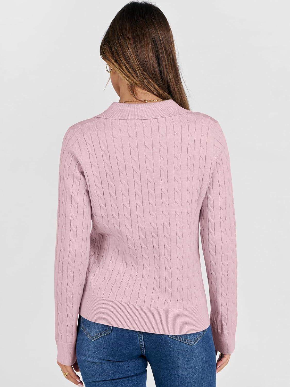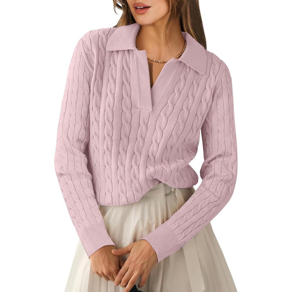 ANRABESS Womens Cable Knit Sweaters Long Sleeve V Neck Sweater Tops Casual Pullover Polo Shirts 2025 Fall Fashion Outfits(Pink)