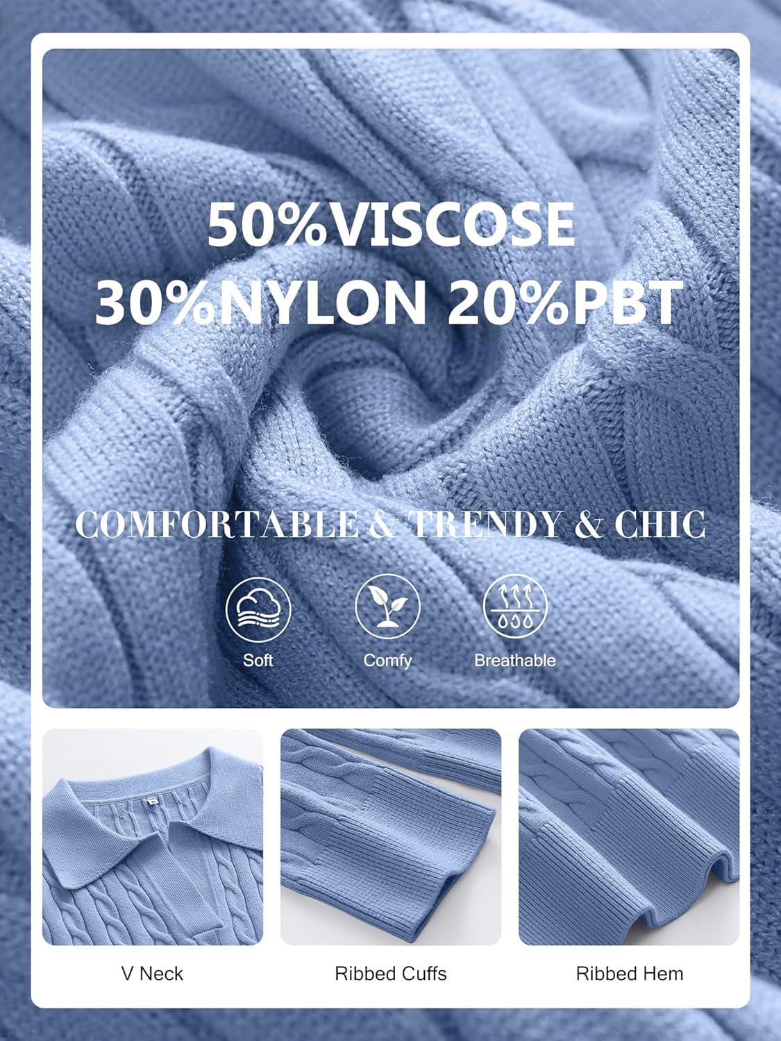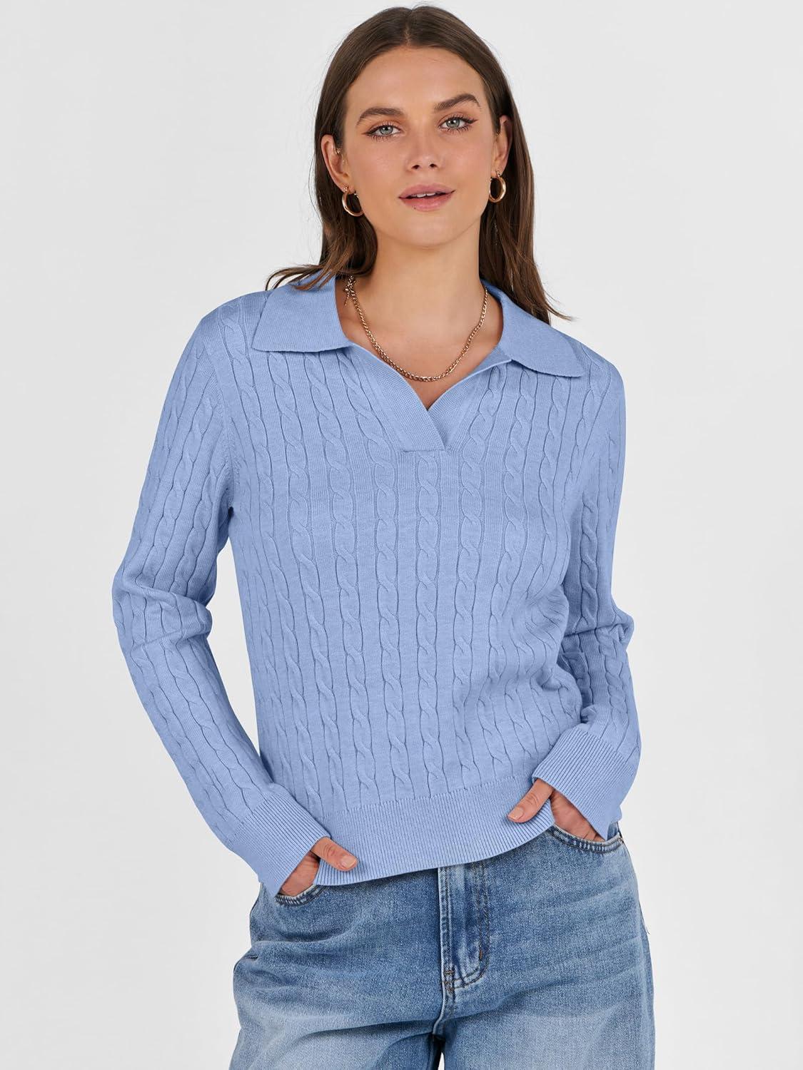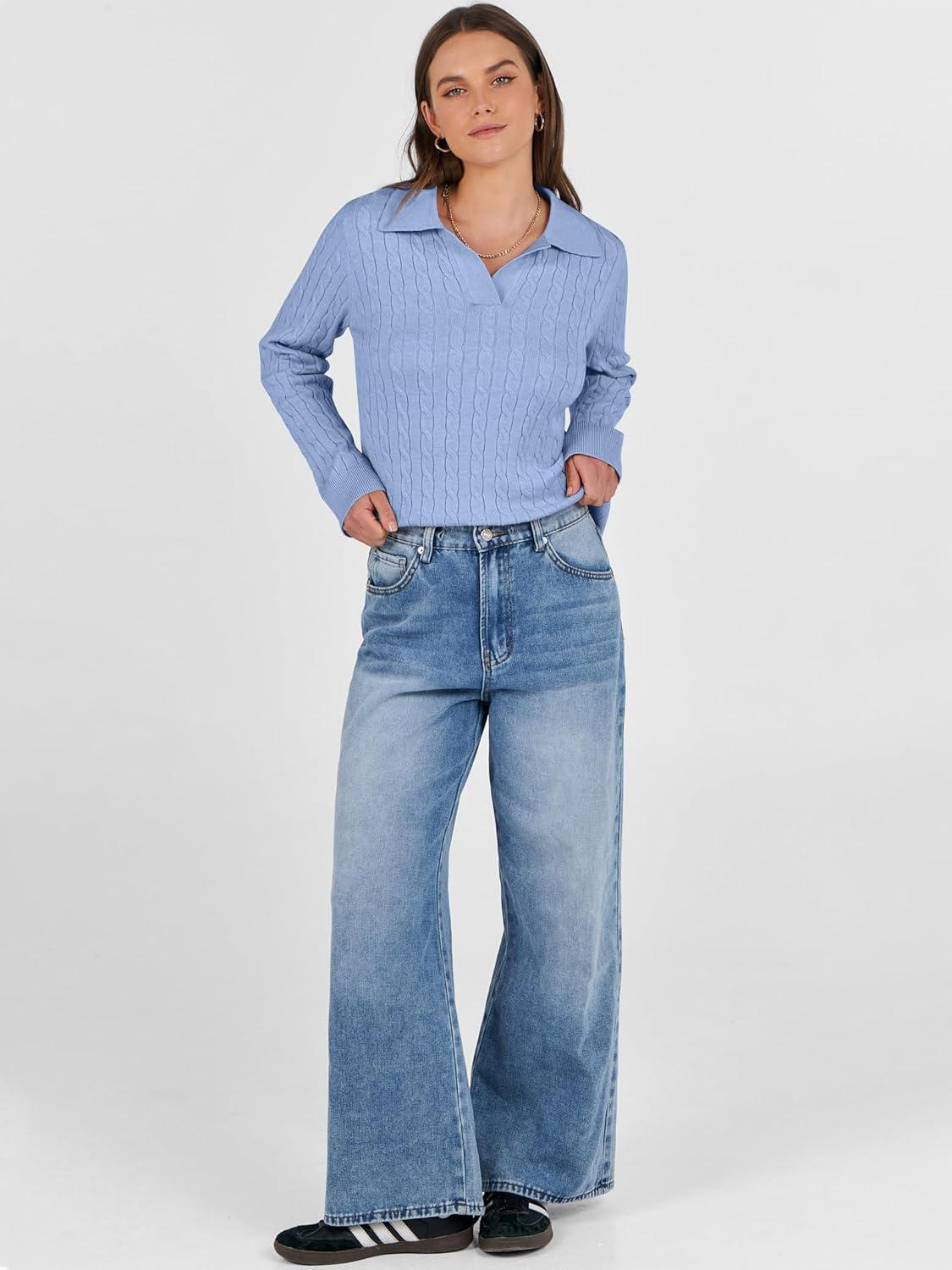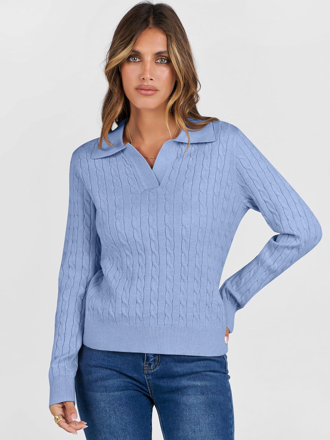 ANRABESS Womens Cable Knit Sweaters Long Sleeve V Neck Sweater Tops Casual Pullover Polo Shirts 2025 Fall Fashion Outfits(Sky)