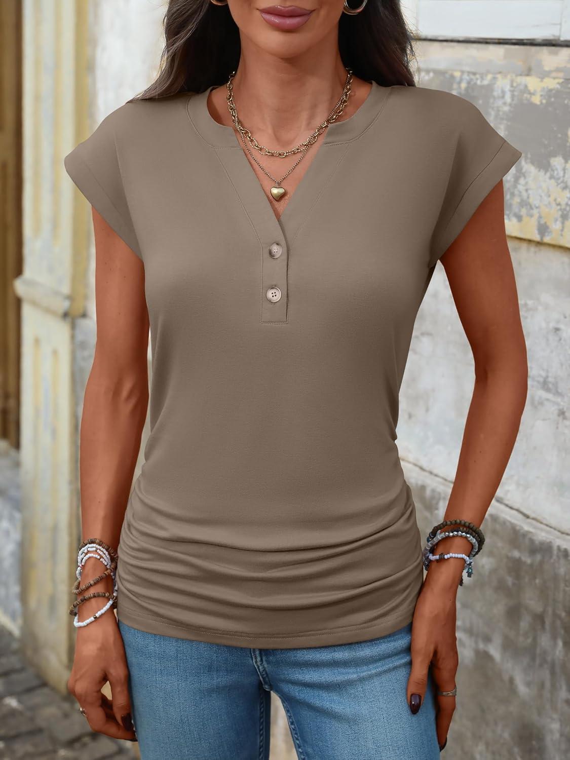 ANRABESS Womens Cap Sleeve Henley Shirts V Neck Ruched Side Top 2026 Summer Dressy Work Blouse Business Casual Outfits(Light Brown)