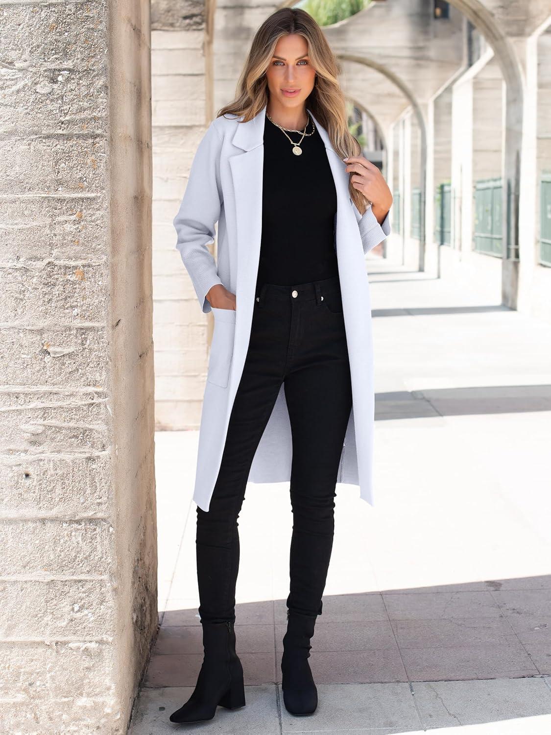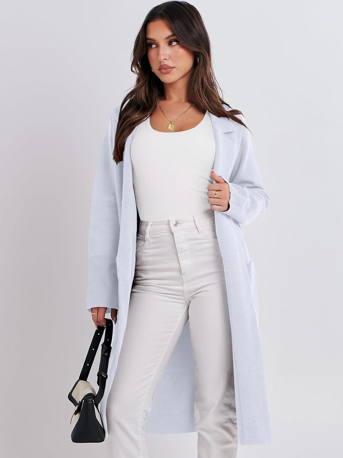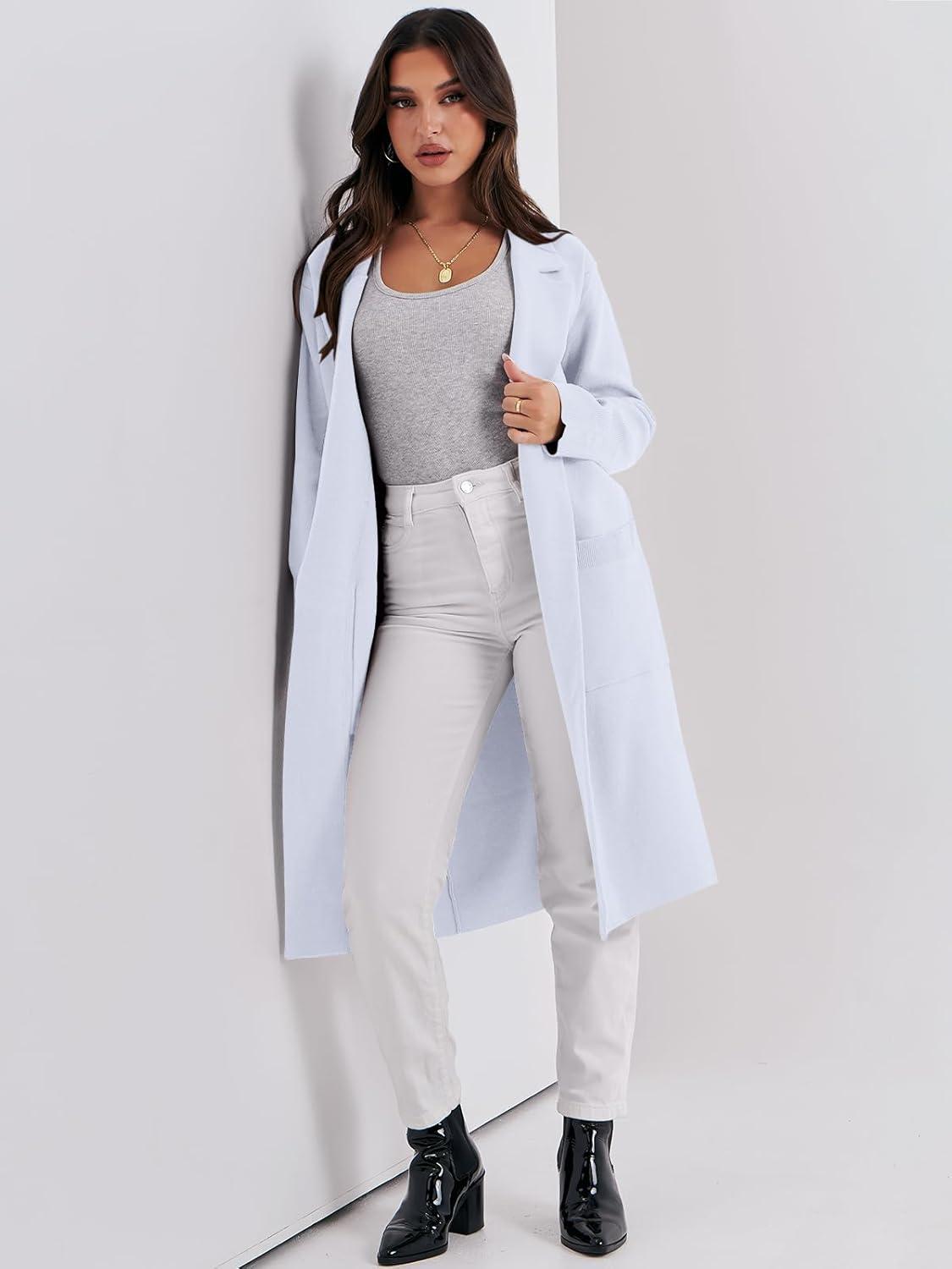ANRABESS Womens Cardigan Sweater 2025 Fall Outfits Knitted Lapel Long Coats Coatigans(Light Blue)