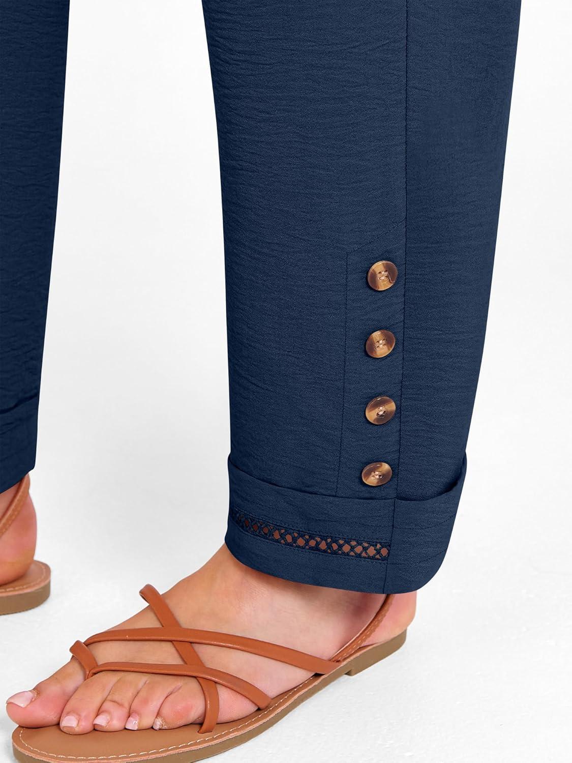 Womens Summer Comfy Slacks Made of 100%Polyester Soft Material. These Capri Pants Have Button Design at the Hem of Pants , Basics Feature. Perfect for Daily Wear, School, Office, Shopping, Travelling, Family Gatherings, Going Out, Etc. elastic waist pants for women/ladies pants/womens slacks/slacks for women/ankle pants for women/summer pants for women/capri pants.