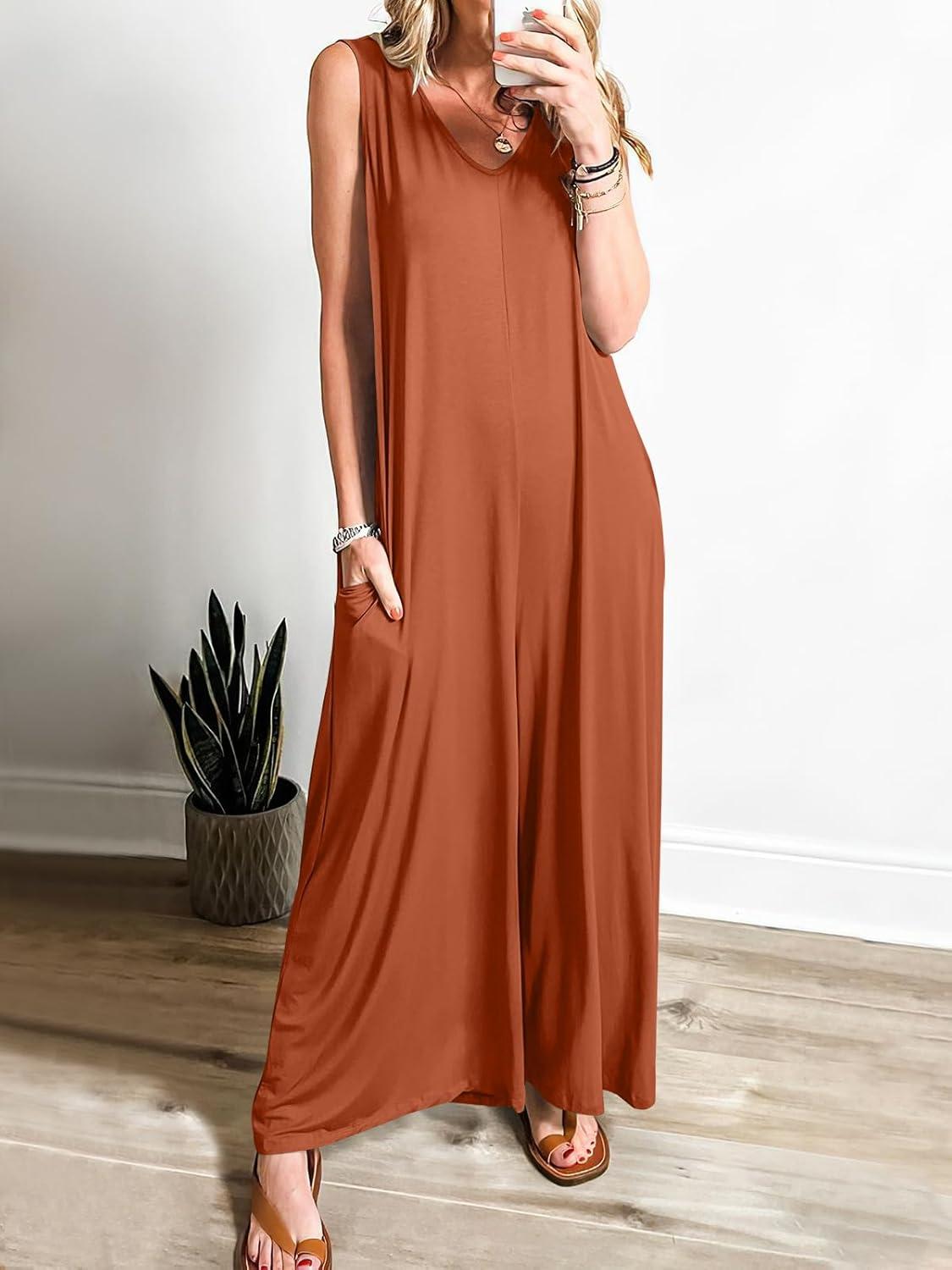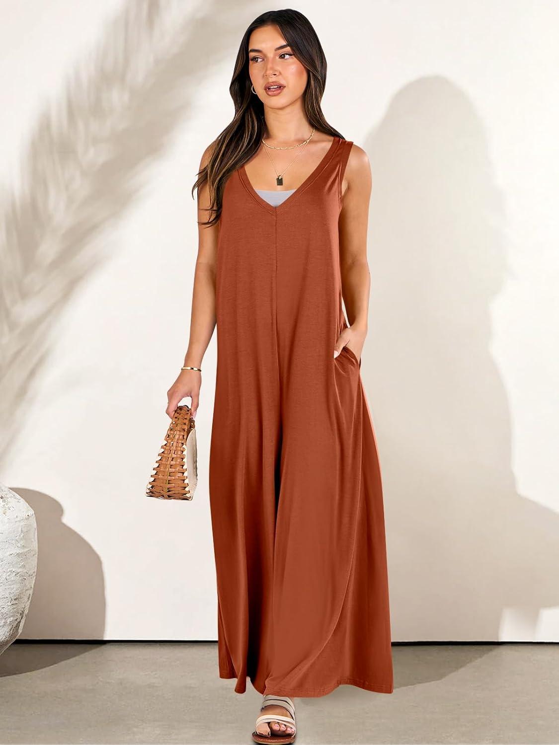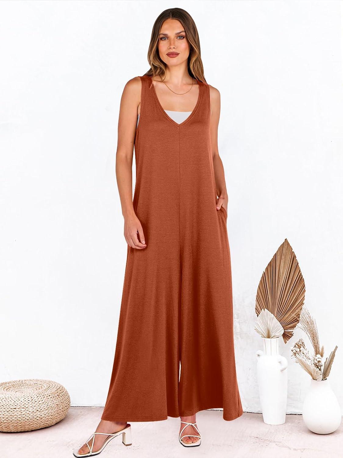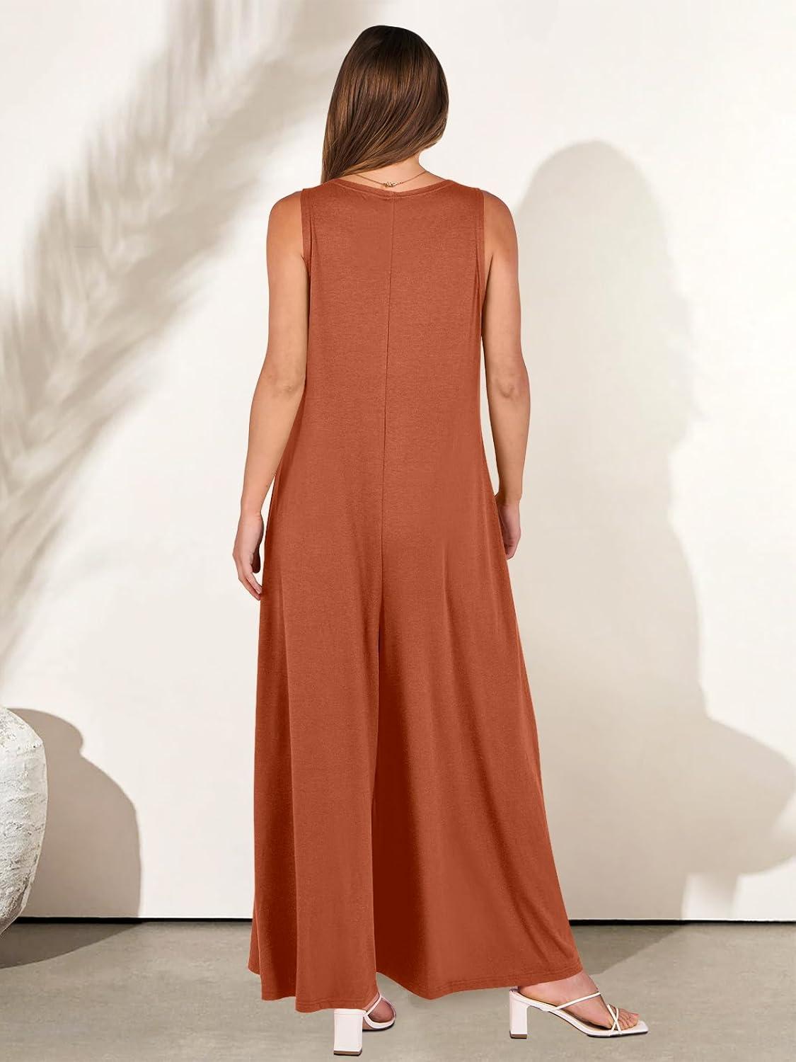 ANRABESS Women’s Casual Summer Loose Jumpsuits Sleeveless Tank V Neck Wide Leg Long Pant Rompers Baggy Jumper with Pockets(Brick Red)