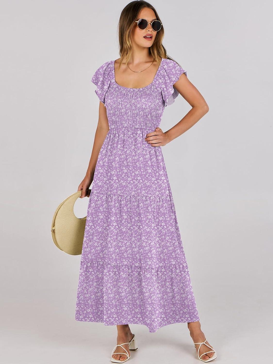ANRABESS Women’s Casual Summer Maxi Dress Flutter Short Sleeve Scoop Neck Smocked A Line Flowy Beach Vacation Long Dresses(Purple Floral)