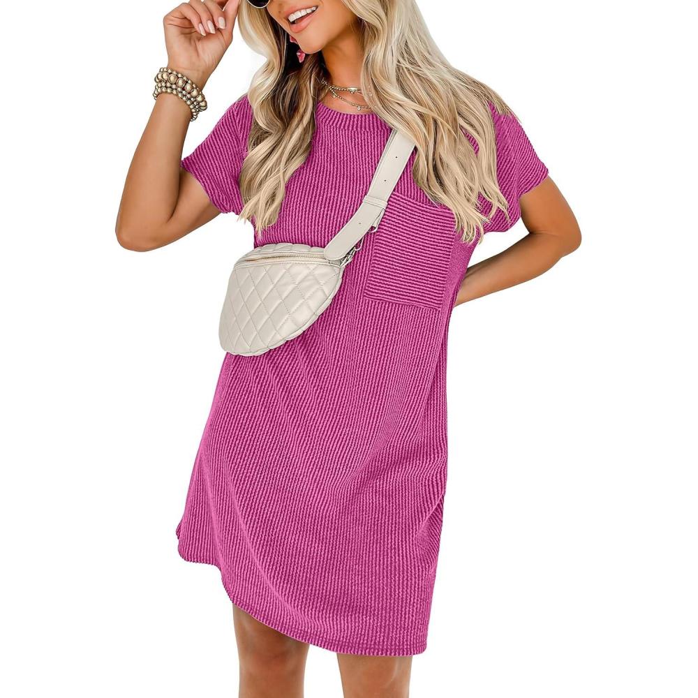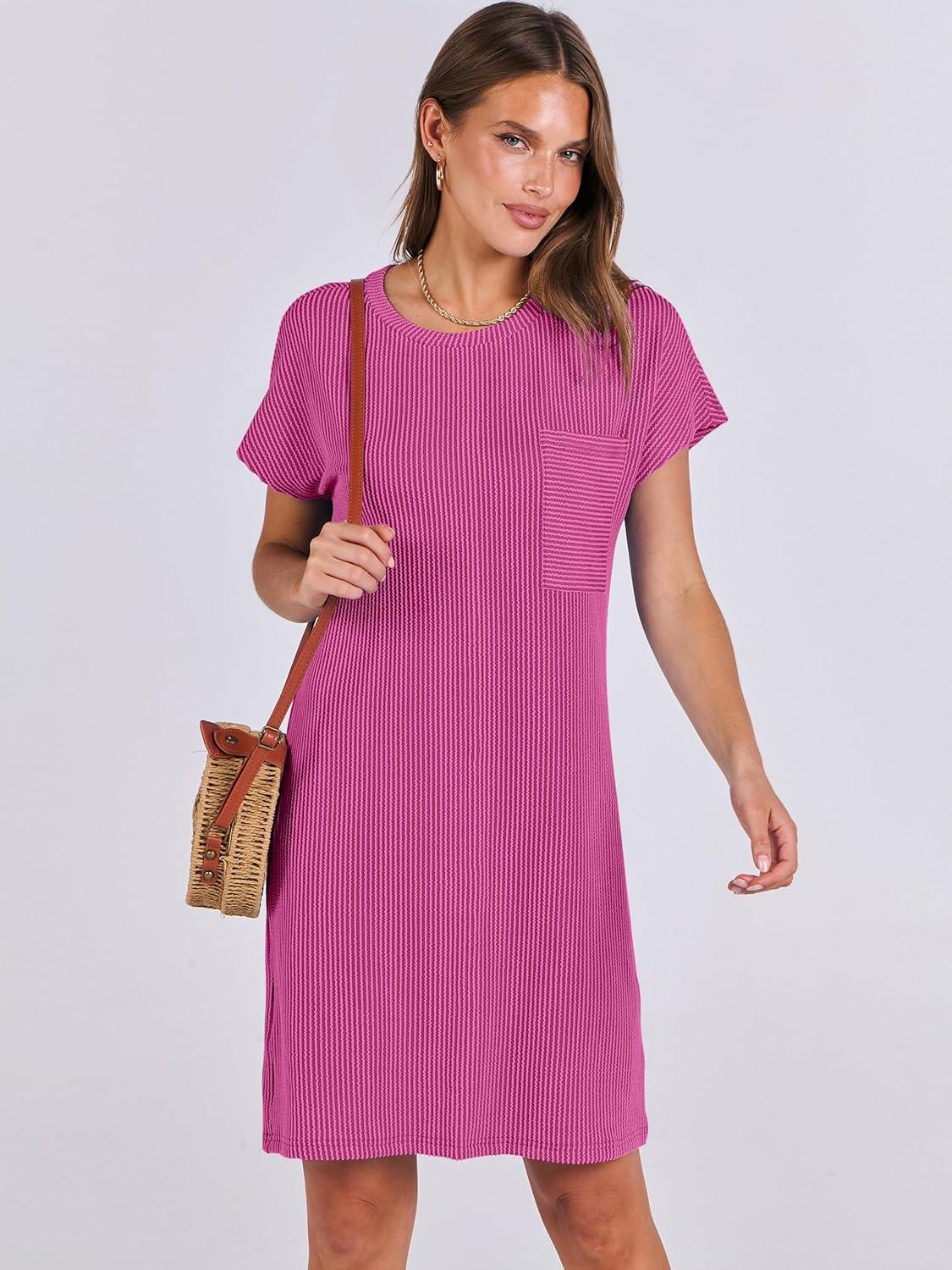 ANRABESS Womens Casual Summer Ribbed Knit Tunic Tshirt Mini Dresses 2026 Trendy Crewneck Short Sleeve Beach Loose Shift Dress(Hot Pink)