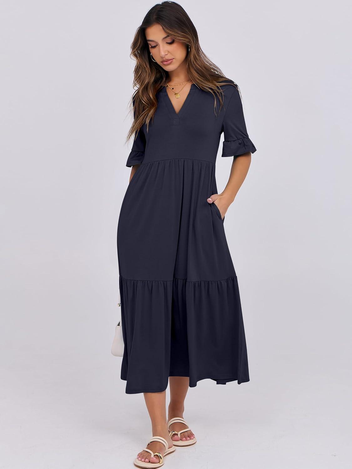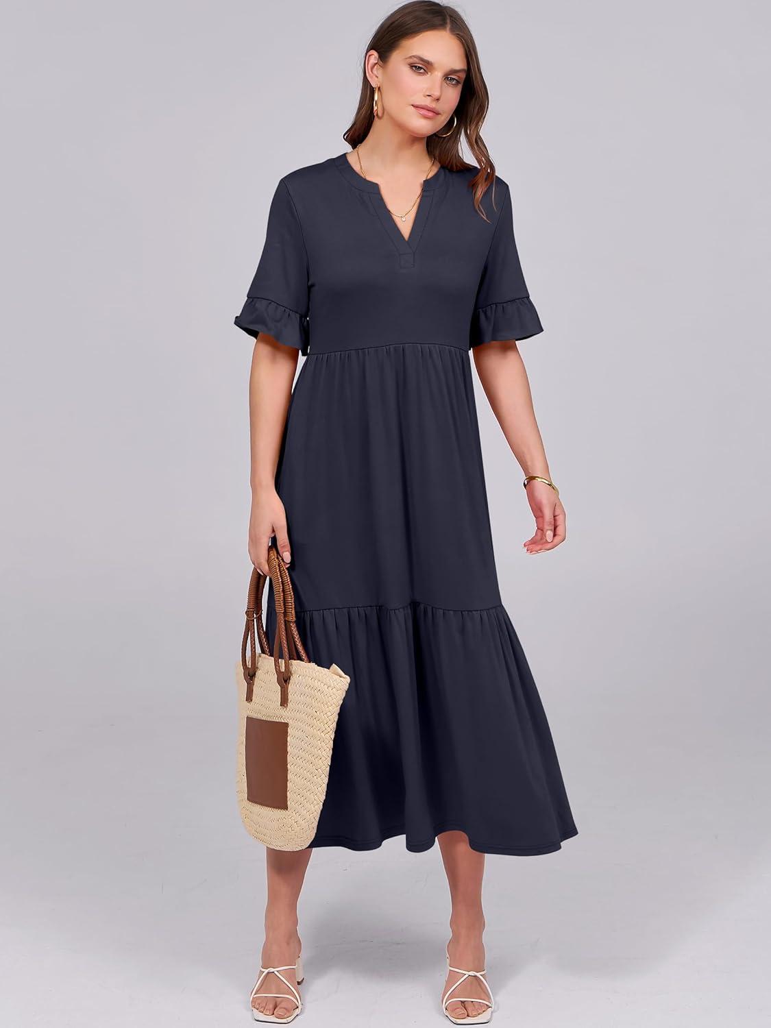 ANRABESS Women’s Casual Summer Ruffle Short Sleeve T Shirts Maxi Dress 2025 Fall V Neck Flowy Tiered Boho Beach Dresses(Navy Blue)