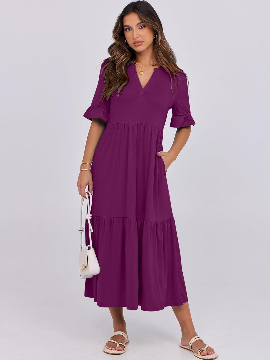 ANRABESS Women’s Casual Summer Ruffle Short Sleeve T Shirts Maxi Dress 2025 Fall V Neck Flowy Tiered Boho Beach Dresses(Purple)