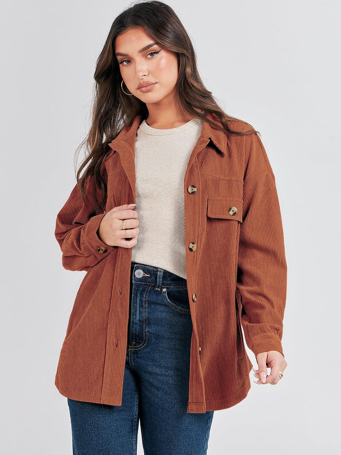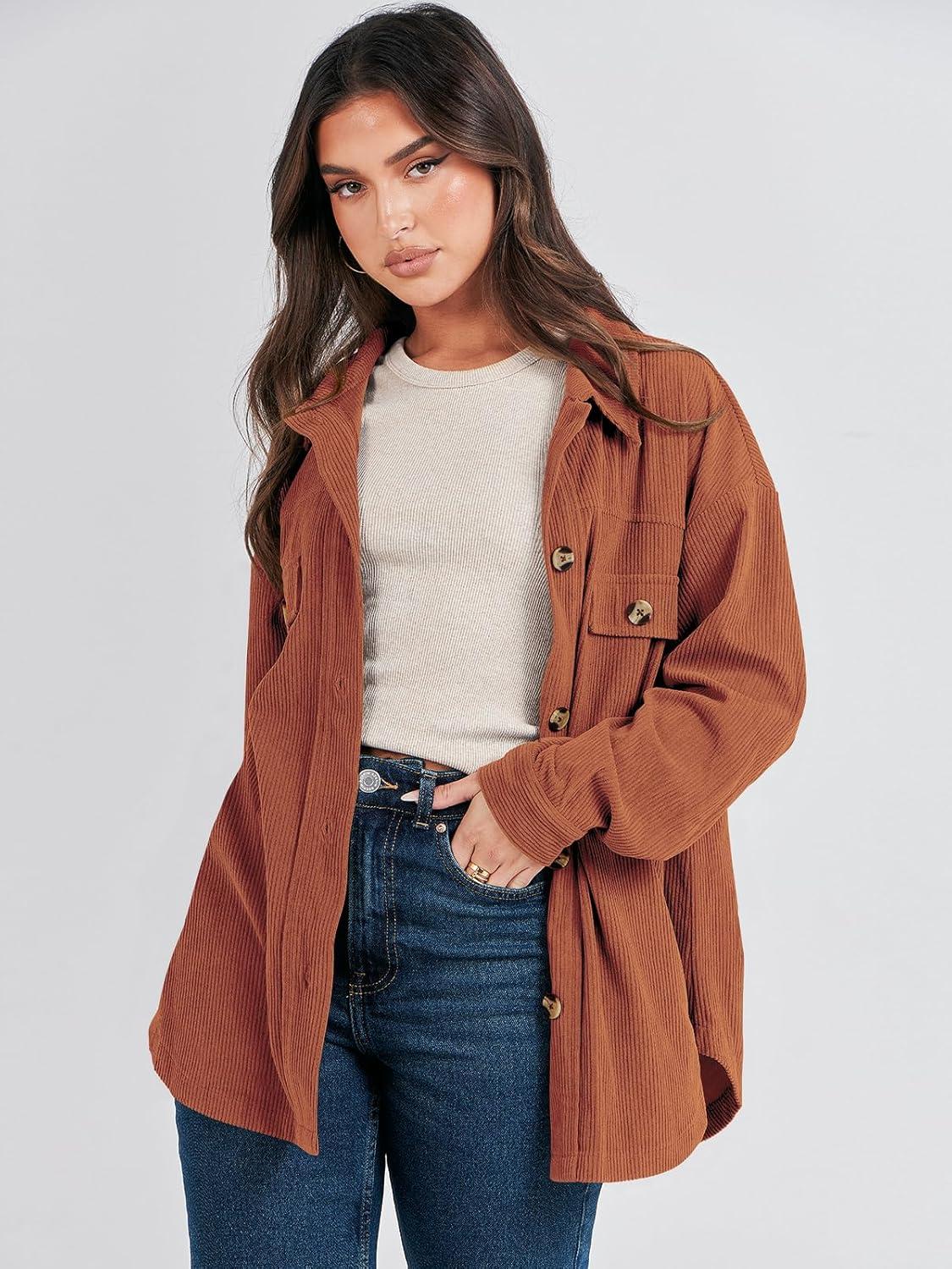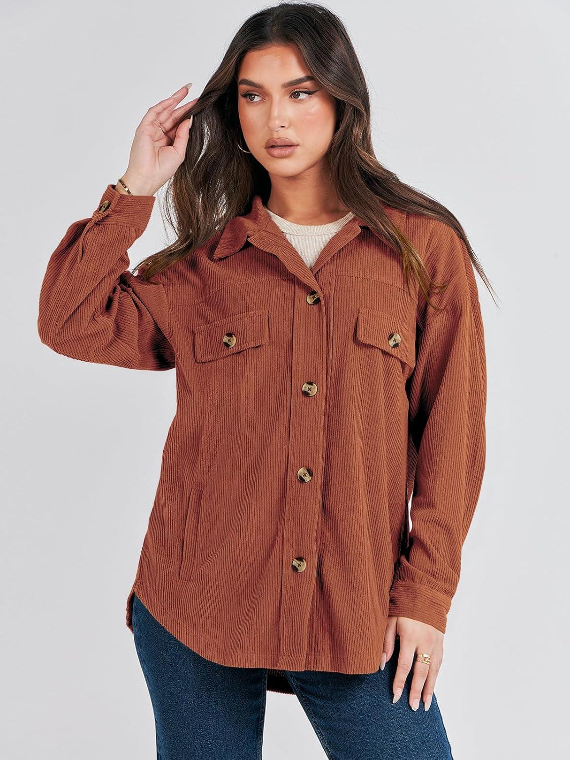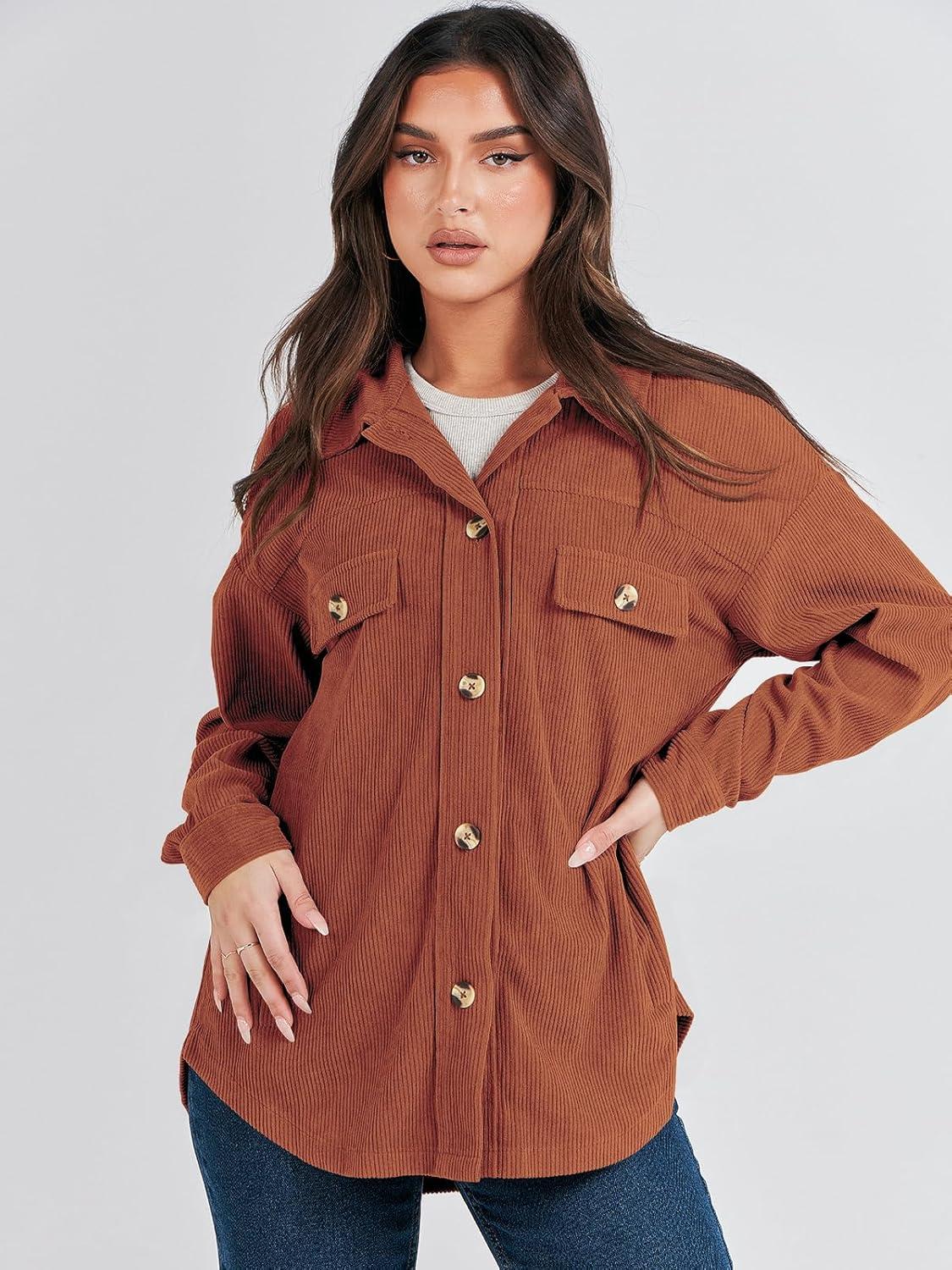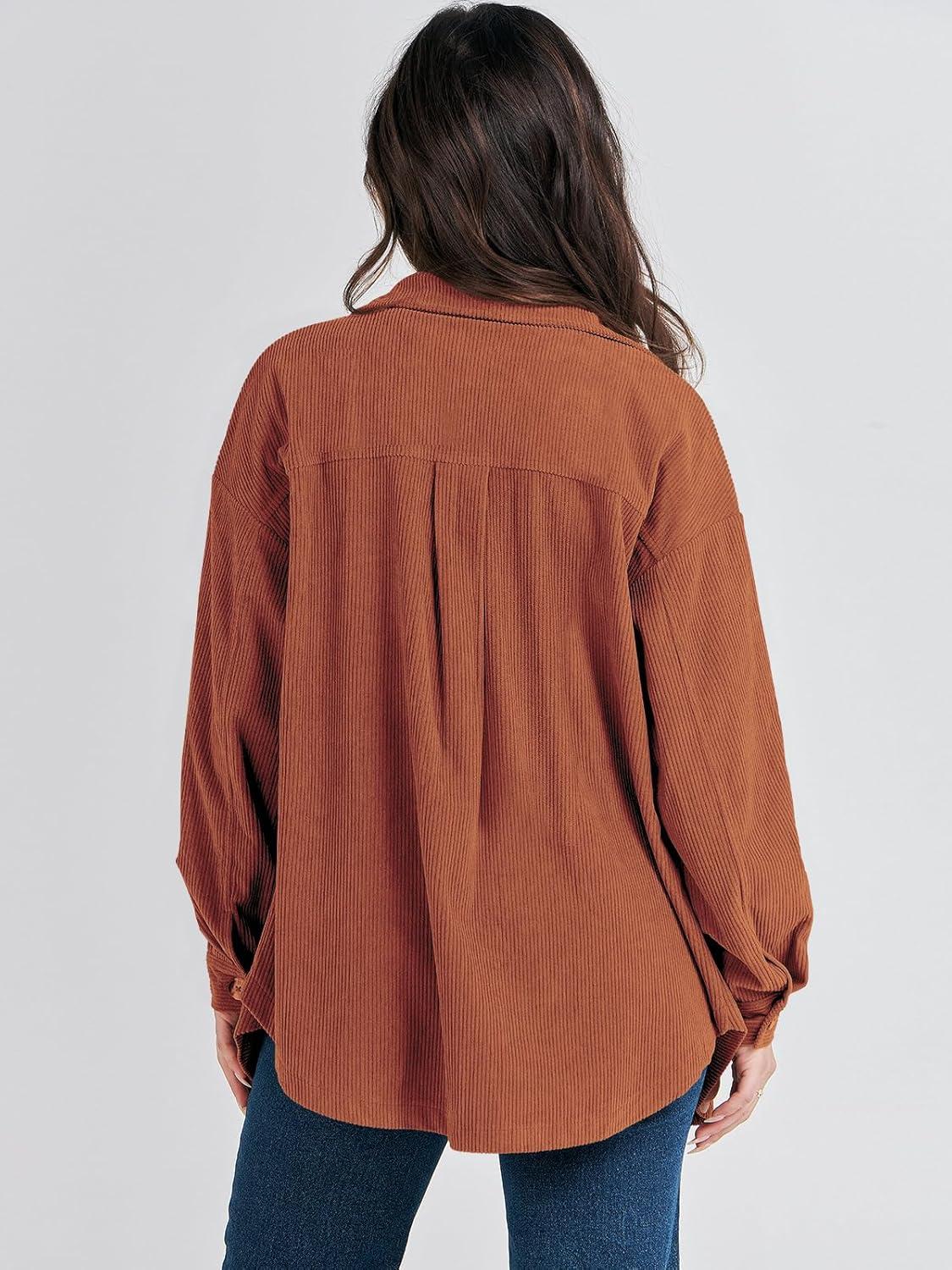 ANRABESS Womens Corduroy Shacket Button Down Shirts Oversized Long Sleeve Casual Cardigan Jacket 2025 Fall Fashion Clothes(Caramel)