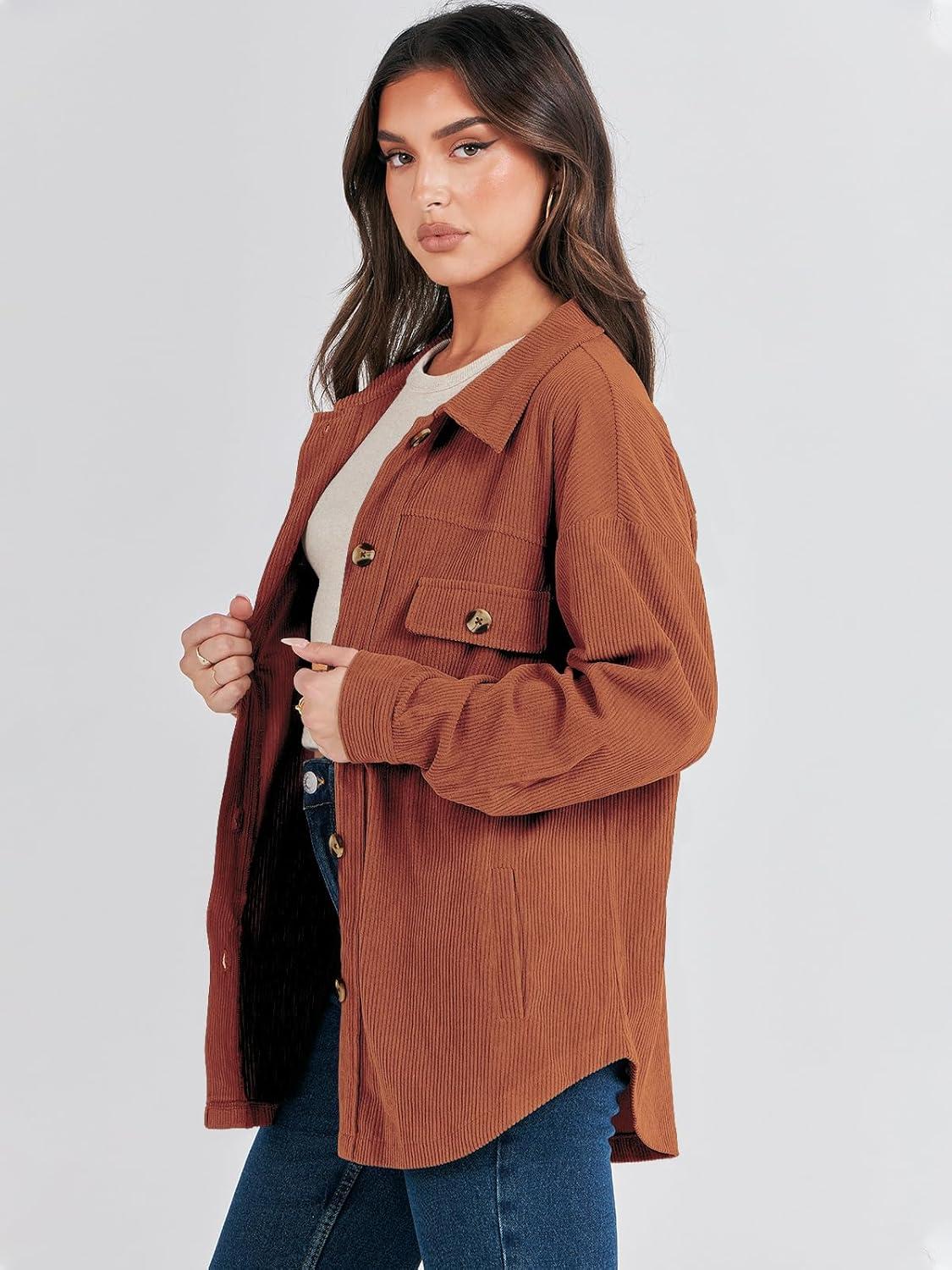 ANRABESS Womens Corduroy Shacket Button Down Shirts Oversized Long Sleeve Casual Cardigan Jacket 2025 Fall Fashion Clothes(Coffee)