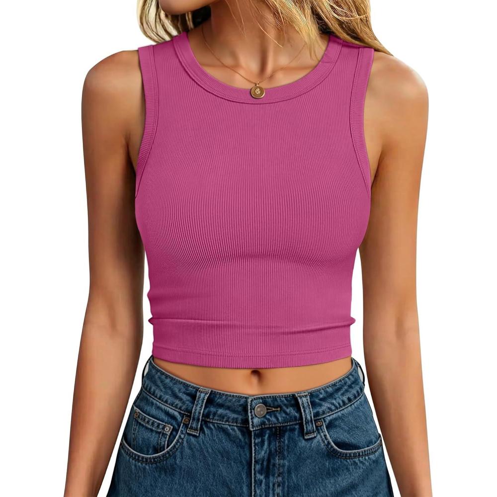 ANRABESS Womens Crop Tank Tops High Neck Sleeveless Ribbed Knit Slim Fit Shirts 2026 Summer Casual Basic Workout Clothes(Hot Pink)