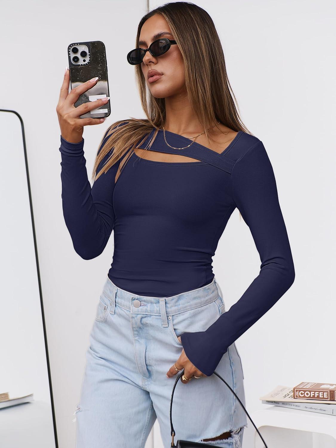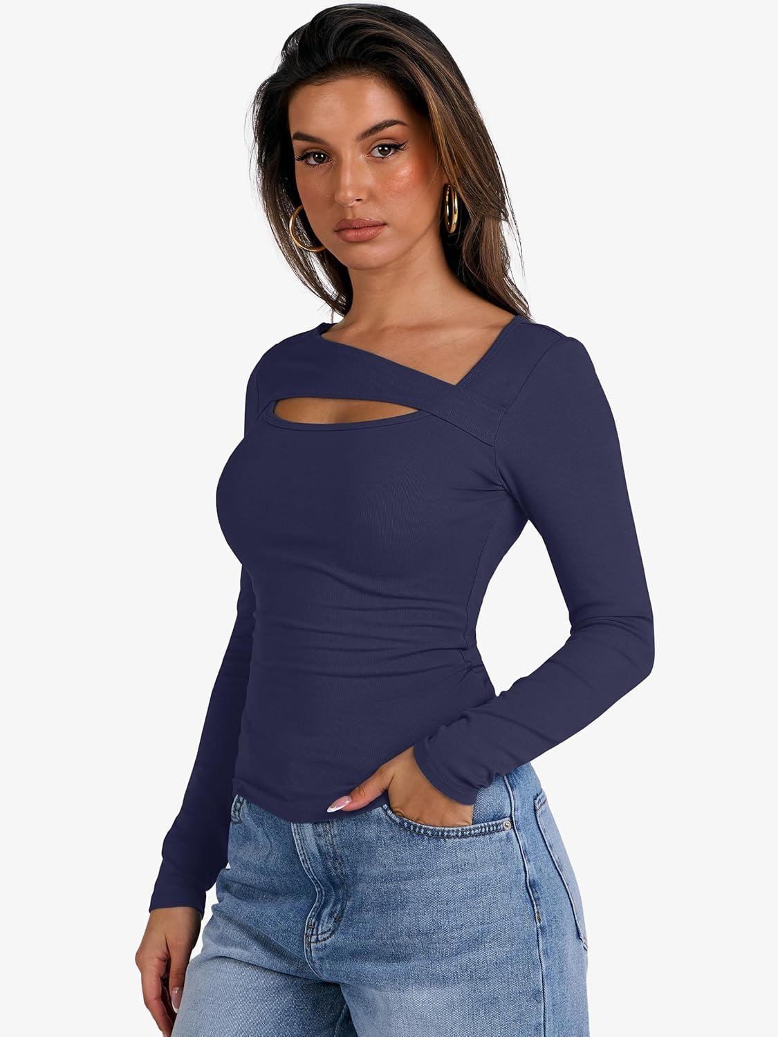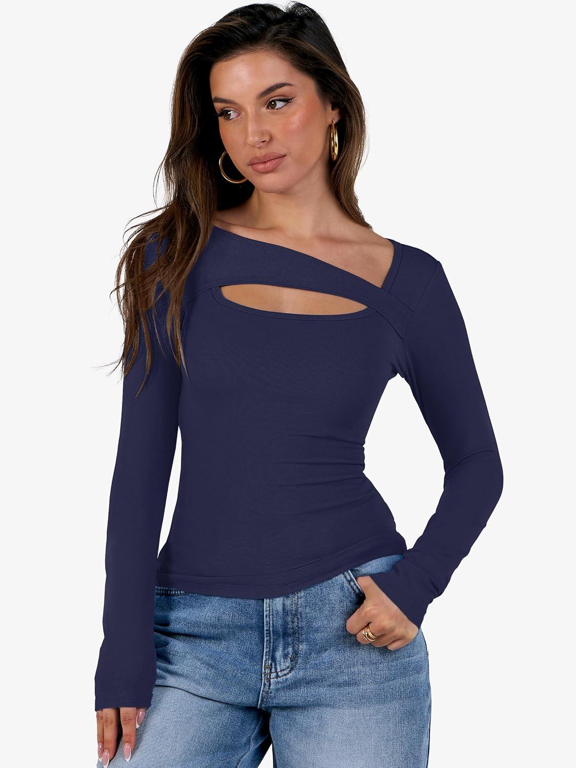 ANRABESS Womens Cutout Tops Trendy Sexy Long Sleeve Shirts Ribbed Slim Fit Tee 2025 Fall Fashion Going Out Tshirts Clothes(Navy Blue)