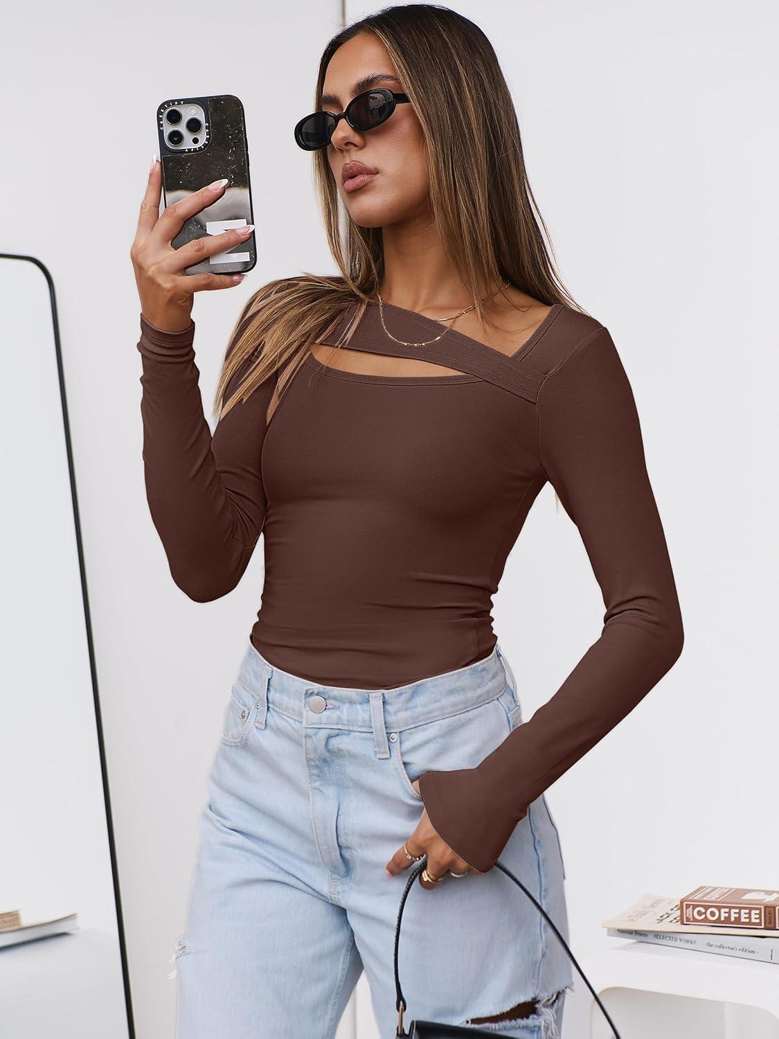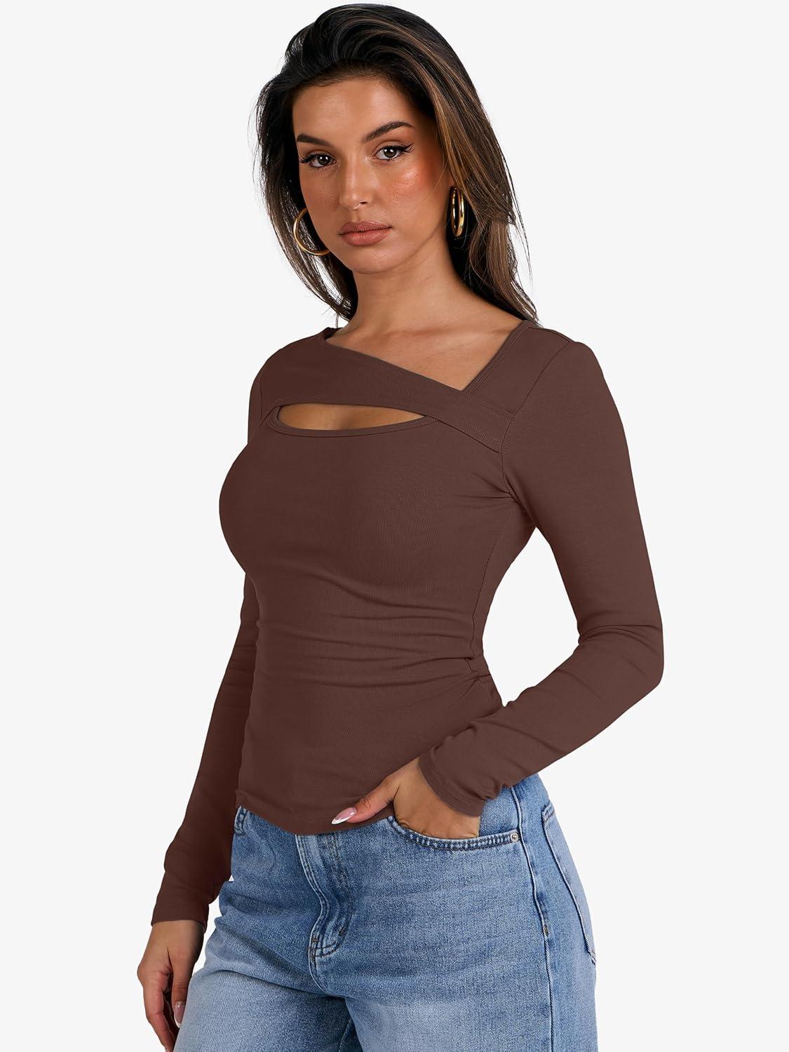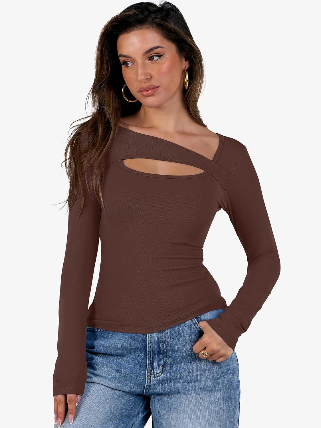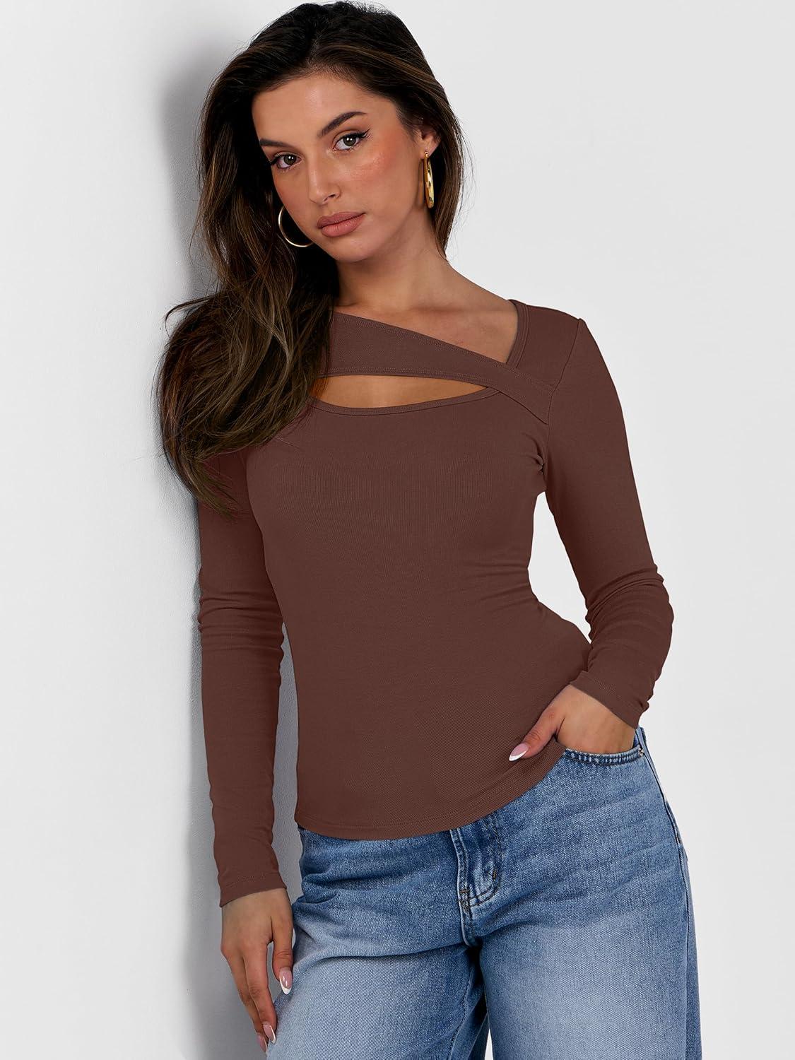 ANRABESS Womens Cutout Tops Trendy Sexy Long Sleeve Shirts Ribbed Slim Fit Tee 2025 Fall Fashion Going Out Tshirts Clothes(Red Brown)