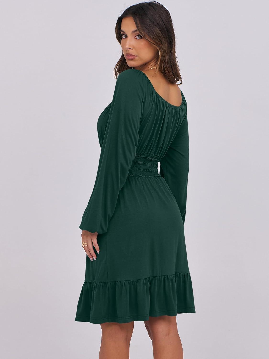 ANRABESS Womens Dress Long Lantern Sleeve Square Neck Elastic Waist Ruffle Flowy Swing A-Line Short Dresses 2025 Fall Fashion(Deep Green)