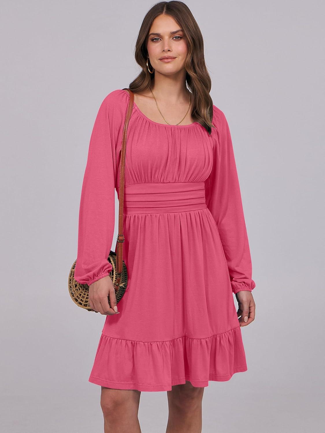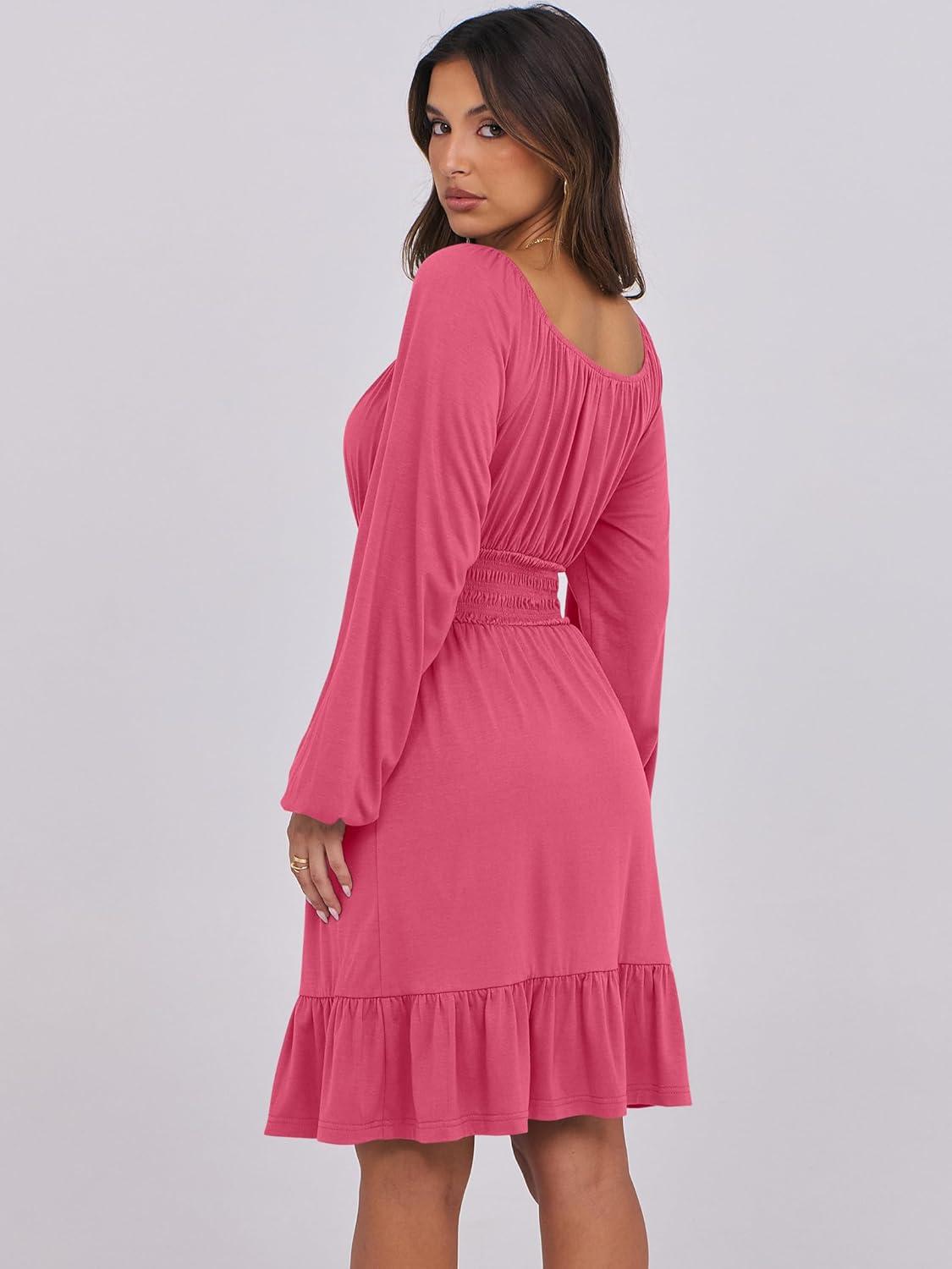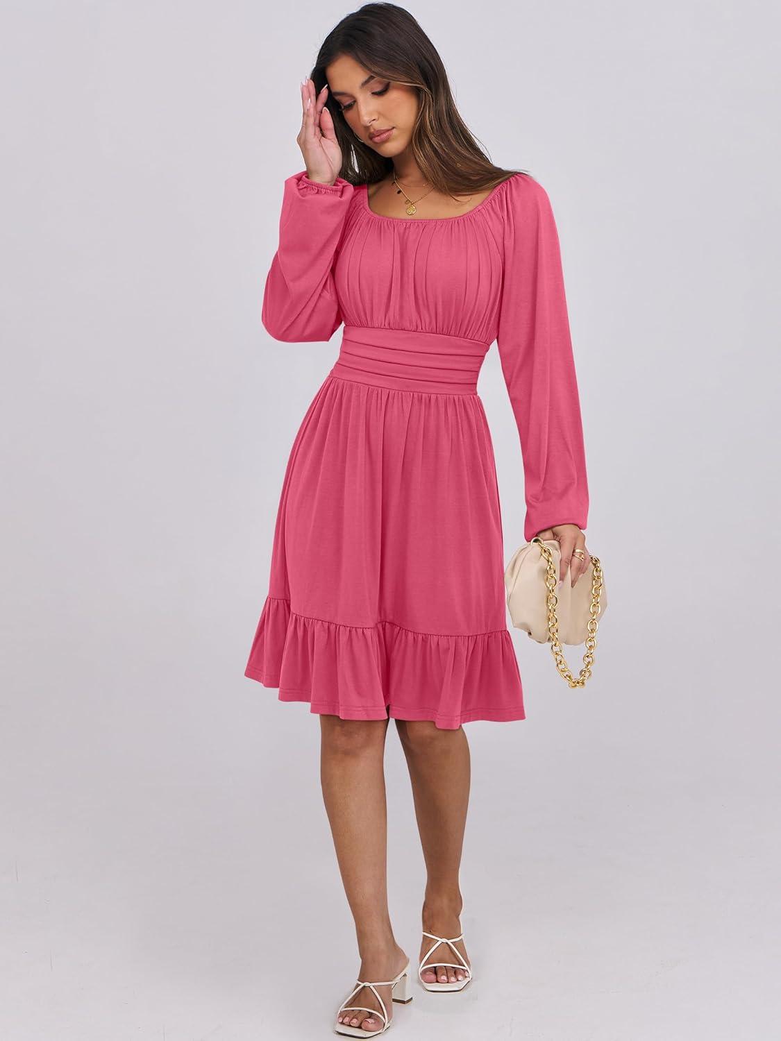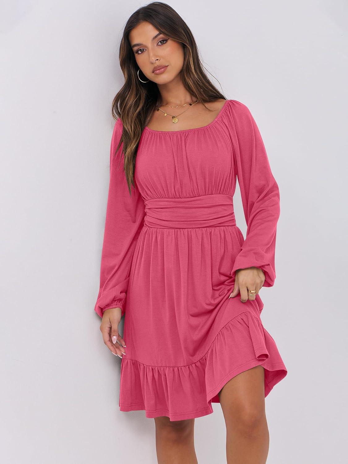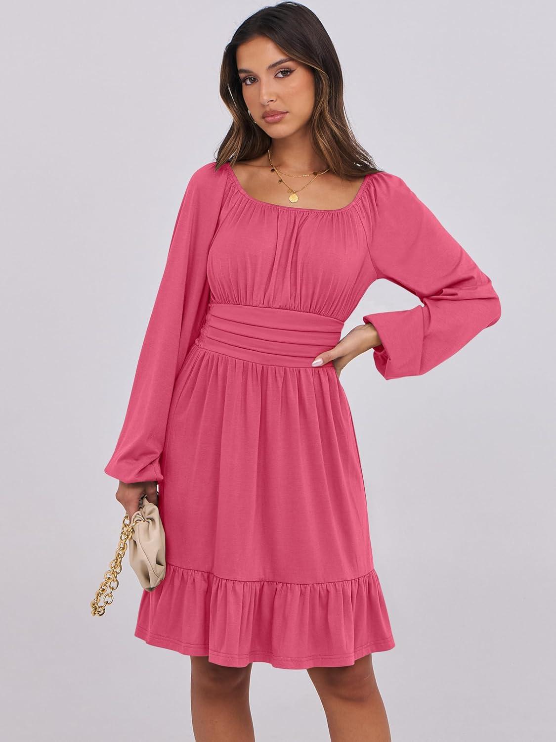 ANRABESS Womens Dress Long Lantern Sleeve Square Neck Elastic Waist Ruffle Flowy Swing A-Line Short Dresses 2025 Fall Fashion(Hot Pink)