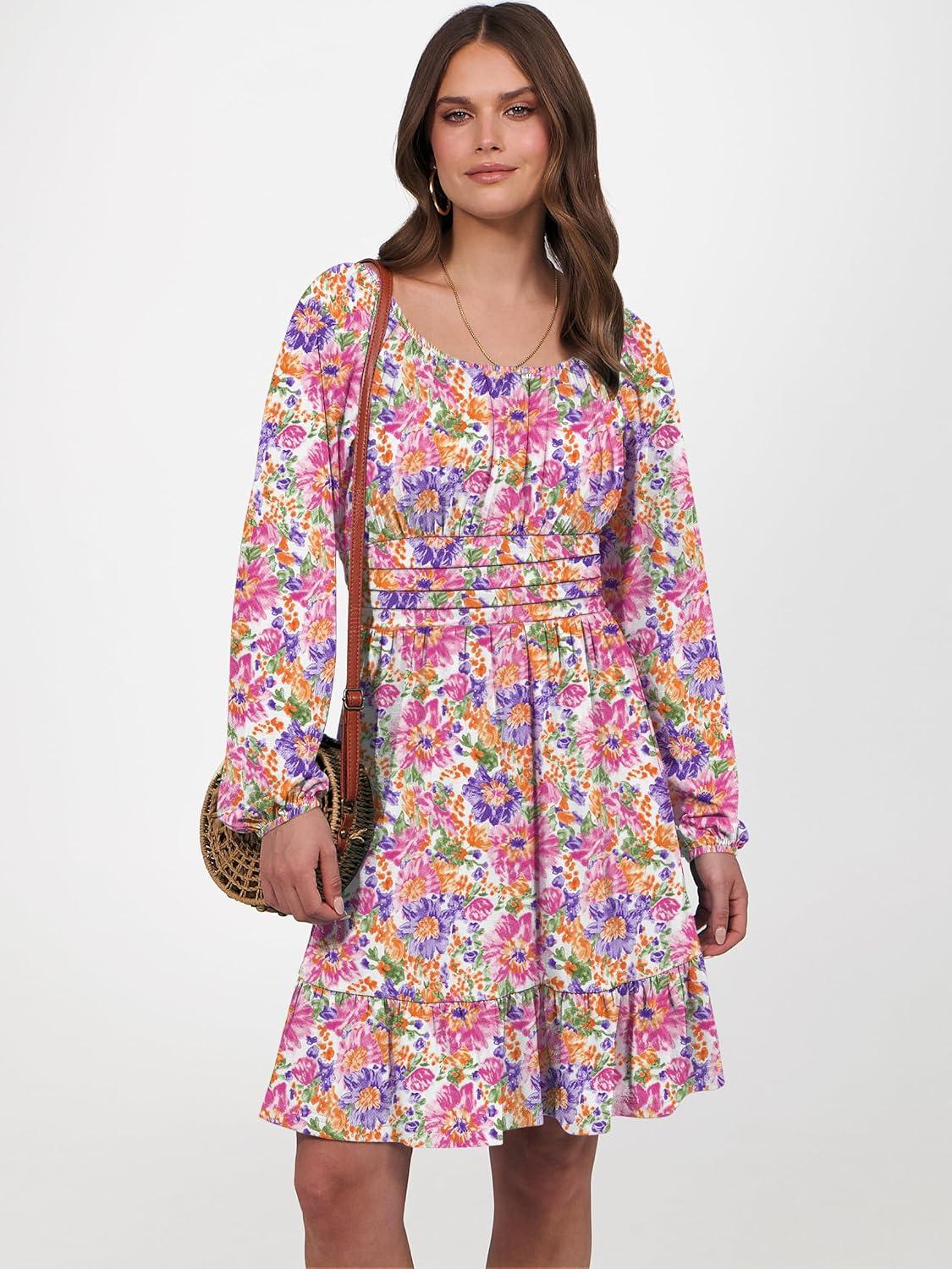 ANRABESS Womens Dress Long Lantern Sleeve Square Neck Elastic Waist Ruffle Flowy Swing A-Line Short Dresses 2025 Fall Fashion(Multicolor Floral)